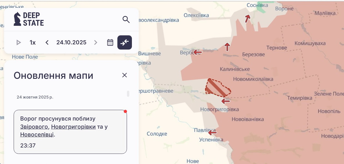 Напомним, по данным Генштаба ВСУ в субботу, 25 октября, россияне на Александровском направлении атаковали, в частности, вблизи сел Нововасильевское, Новогригорьевка, Павловка Запорожской области.