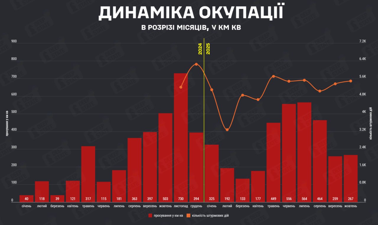 В октябре враг оккупировал 267 кв. км украинской территории – примерно столько же, сколько в сентябре. Об этом говорится в сообщении украинского аналитического проекта DeepState, передает "Справжнє".
