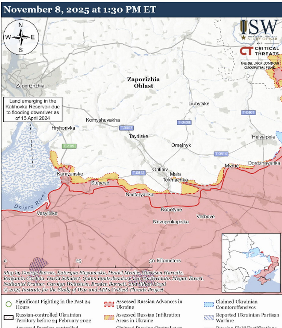 "8 ноября российские войска продолжили наступательные операции на западе Запорожской области, но не продвинулись вперед", – говорится в отчете.