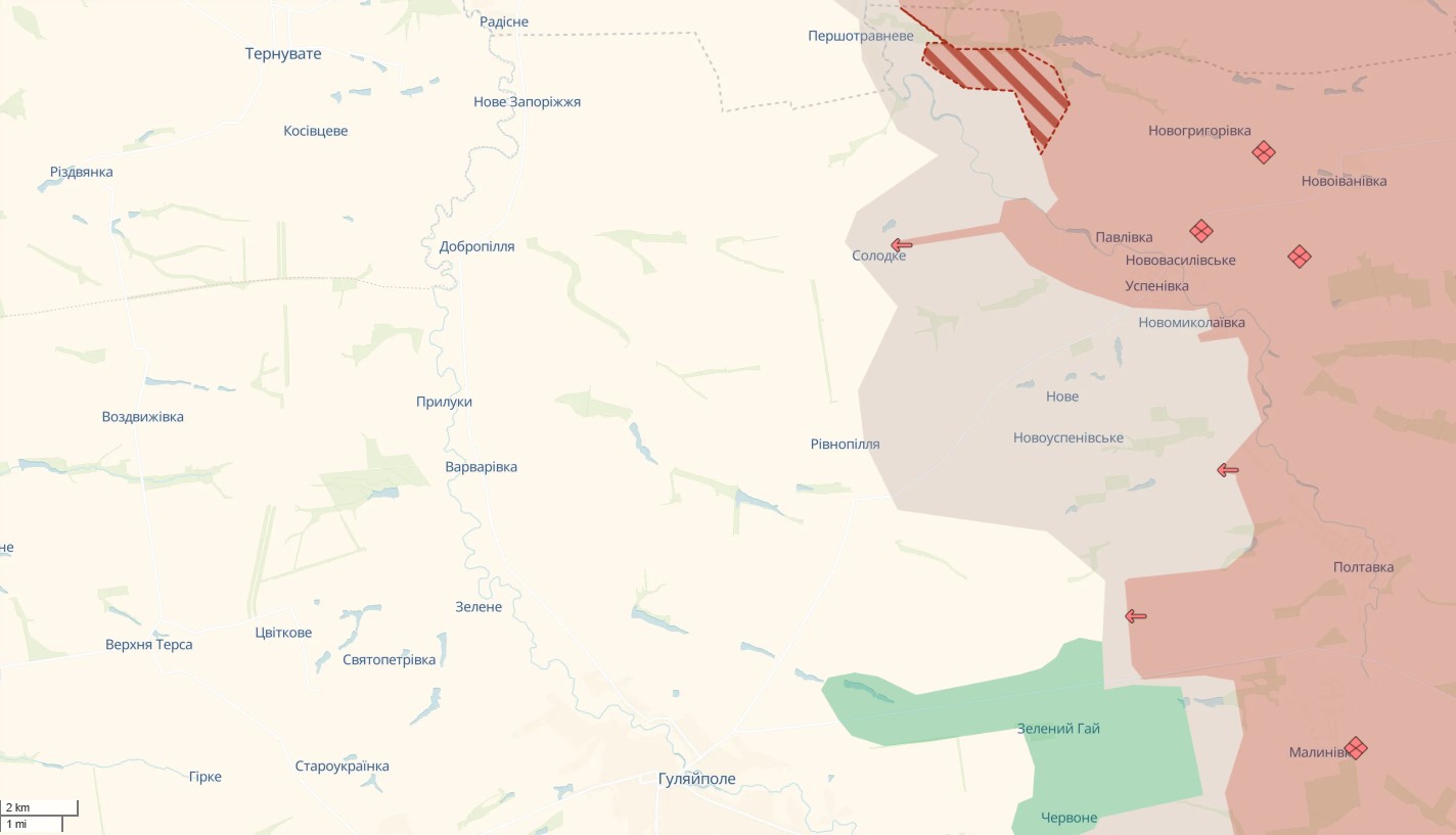 Российские оккупационные войска продвинулись в Пологовском районе Запорожской области – вблизи села Красногорское, передает "Справжнє". Обновленные данные на карте боевых действий обозначил украинский аналитический проект DeepState.