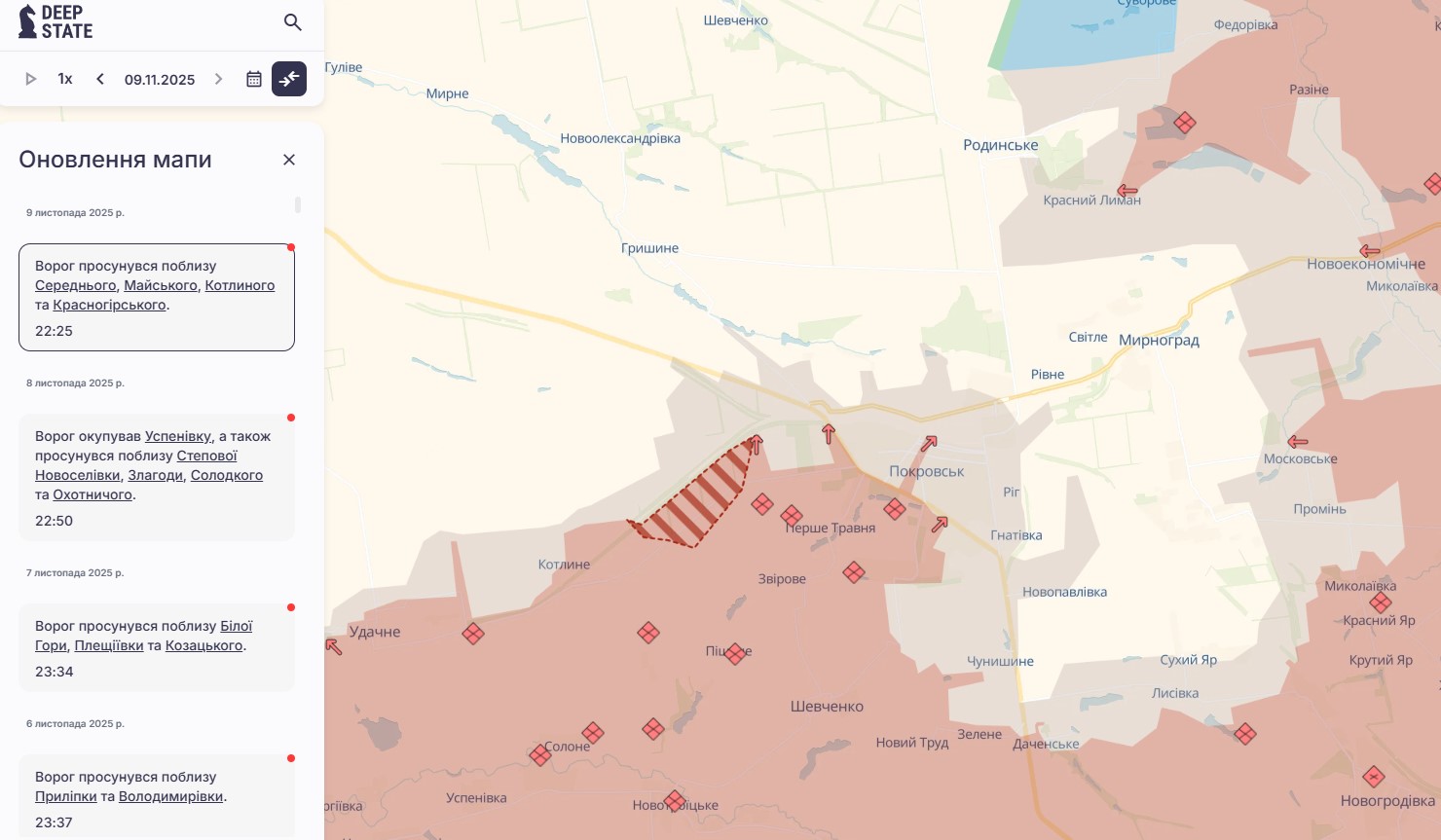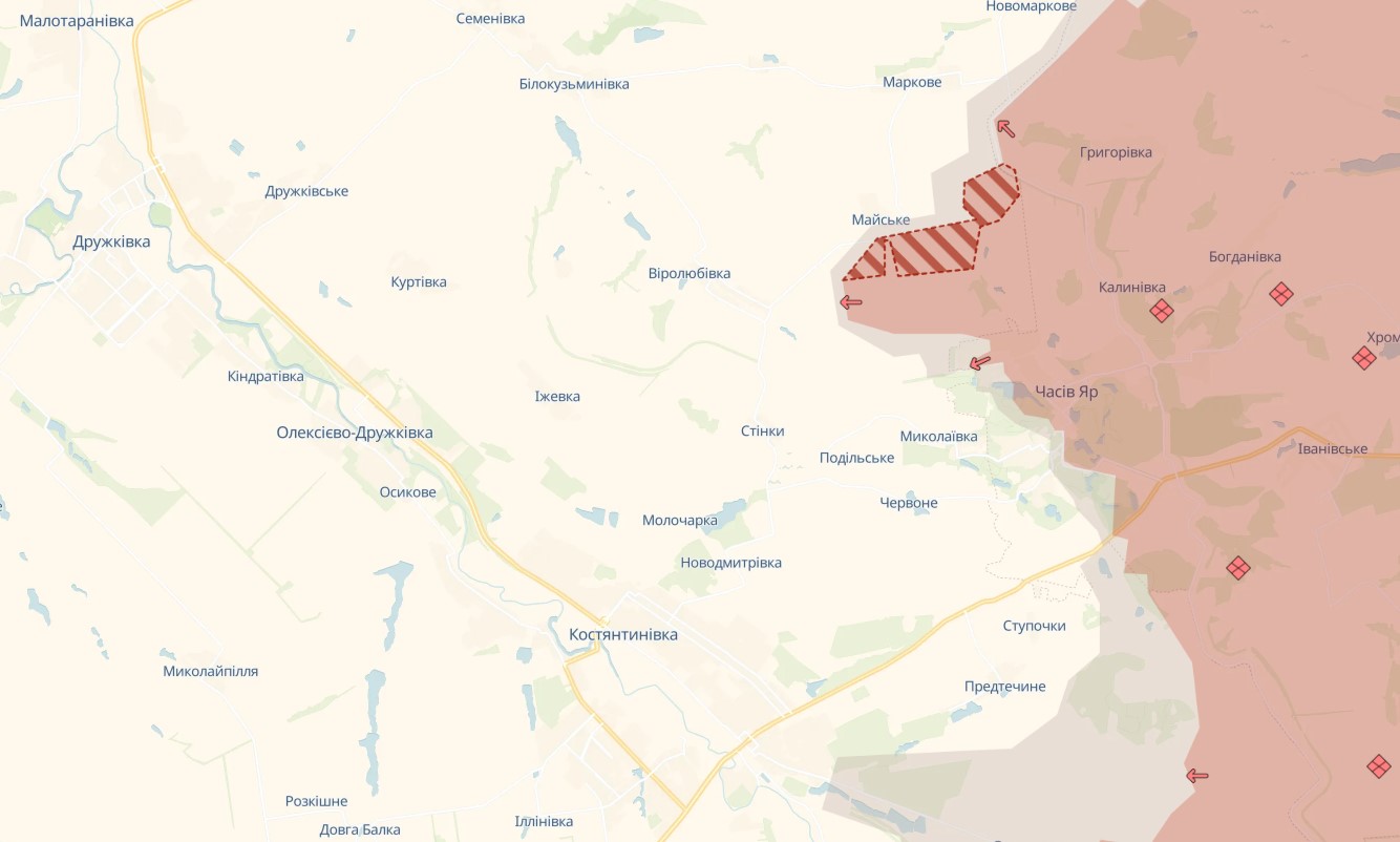 Кроме того, по данным аналитиков, захватчики продвинулись вблизи сел Среднее и Майское Краматорского района, а также поселка Котлино Покровского района Донецкой области.