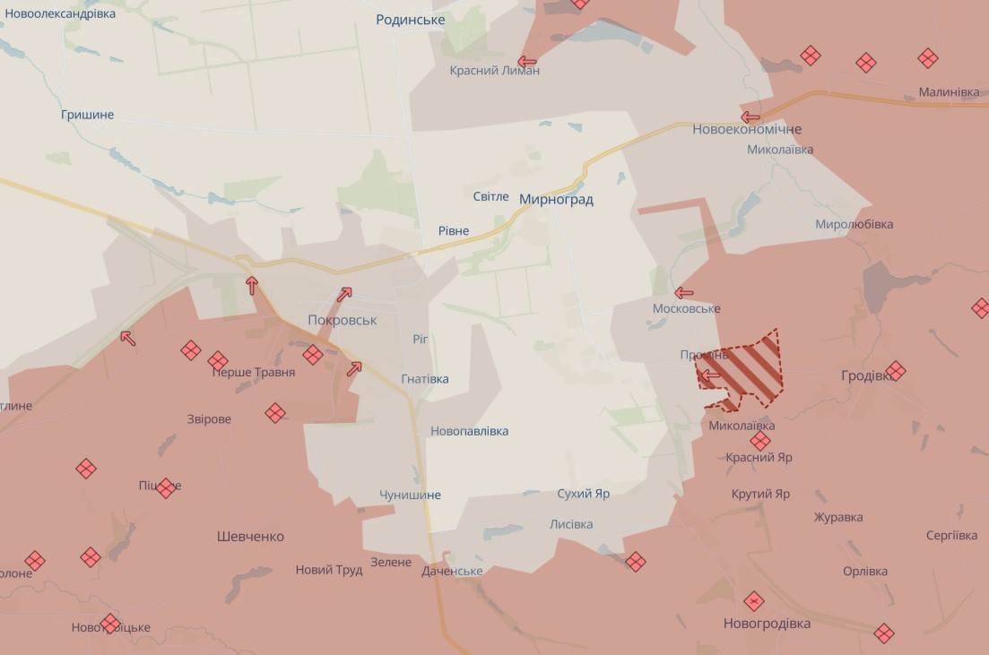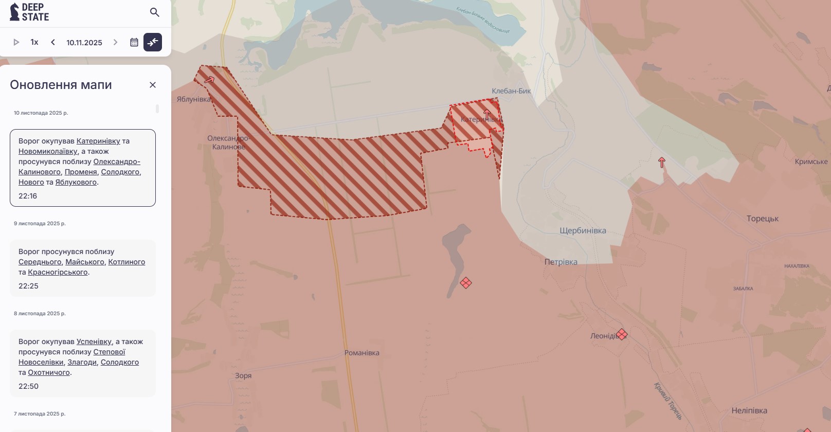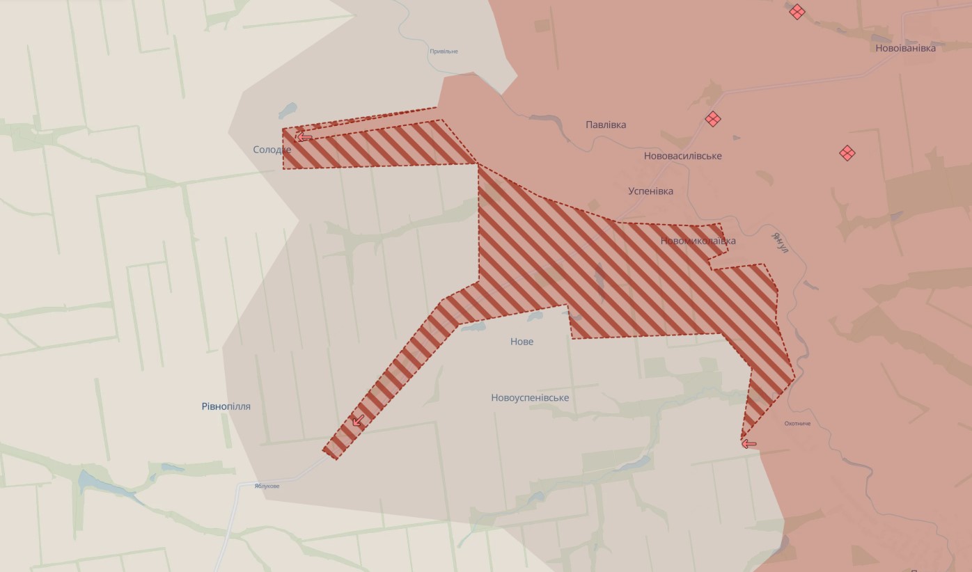 "Враг оккупировал Екатериновку и Новониколаевку, а также продвинулся вблизи Александро-Калинового, Луча, Сладкого, Нового и Яблокового", – оценивают в DeepState.