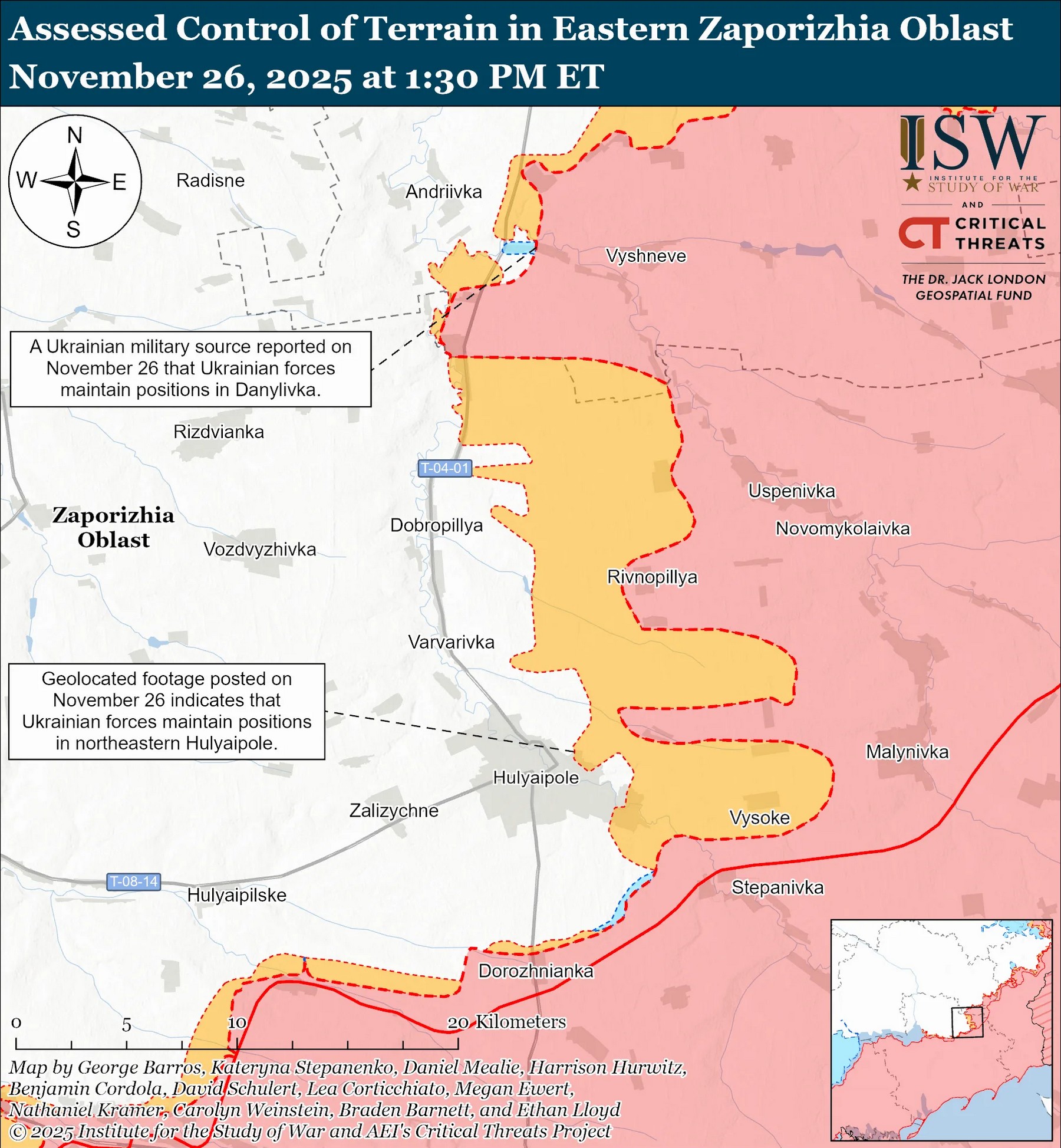 Западные эксперты утверждают, что 26 ноября украинские подразделения продвинулись на Гуляйпольском направлении, подойдя к автомагистрали Т-0401 Покровское-Гуляйполе – к западу от села Даниловка Синельниковского района (севернее Гуляйполя).