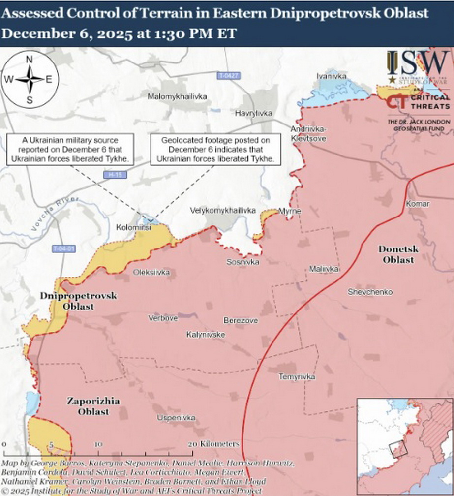В ISW также сообщили об успехах украинских войск на Днепровщине: геолоцированные видеозаписи от 6 декабря свидетельствуют, что защитники освободили Тихое, о захвате которого россияне сообщили в конце ноября.