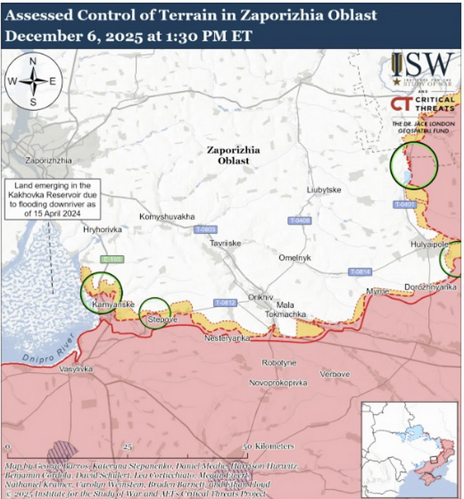 Армия РФ в субботу, 6 декабря, продолжала наступательные операции на востоке Запорожской области, но не достигла подтвержденного прогресса. Об этом говорится в обновленном отчете Института изучения войны (ISW), передает "Справжнє".