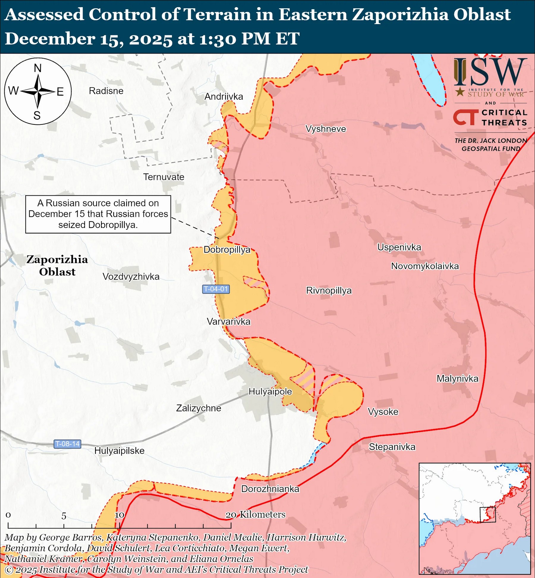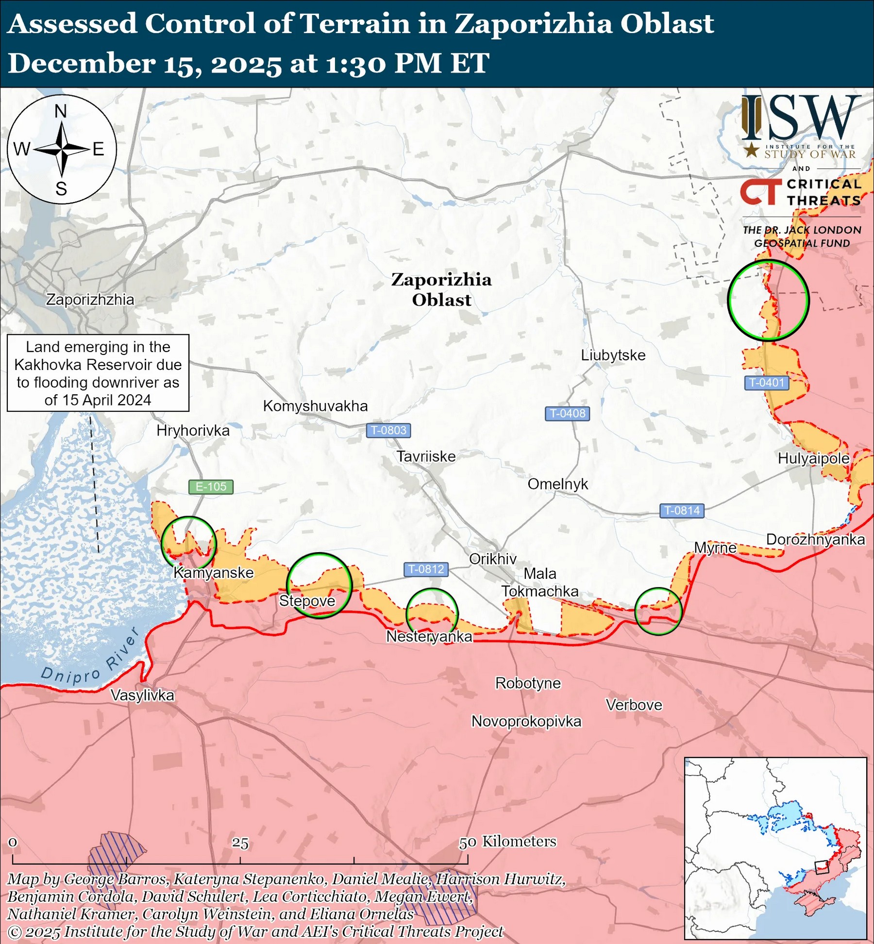 "Геолокационные видеозаписи, опубликованные 15 декабря, свидетельствуют о том, что украинские войска продвигались к югу от Степногорска (к западу от Орехова)", – оценивают в ISW.