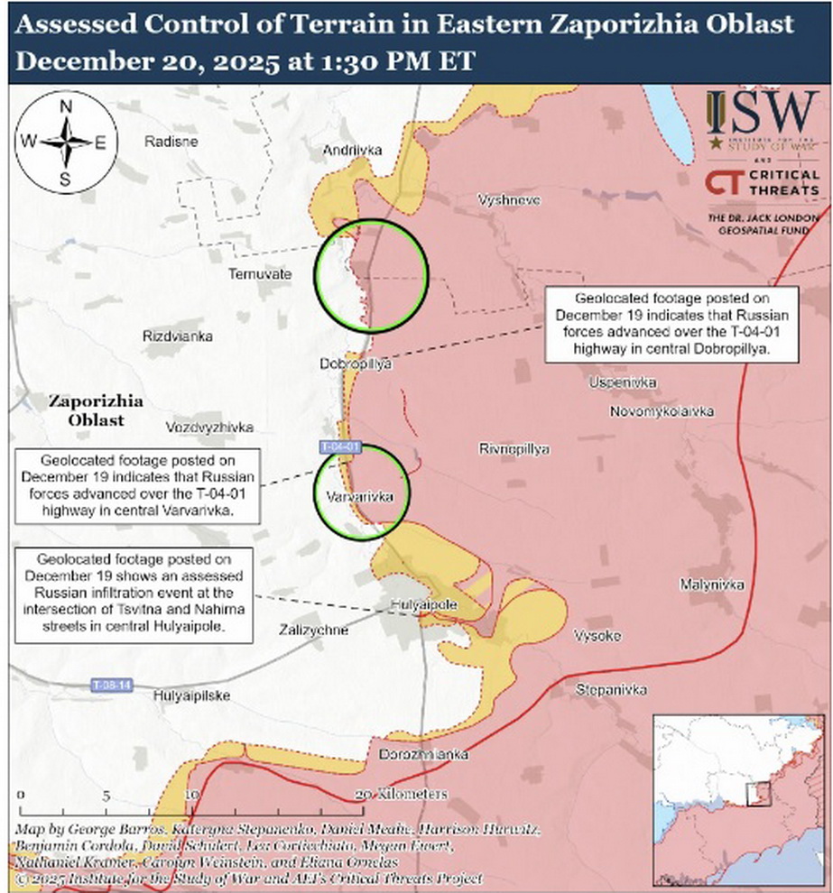 Геолоцированные видеоматериалы, опубликованные 19 декабря, свидетельствуют о продвижении российских войск на востоке Запорожской области. Об этом говорится в последнем отчете Института изучения войны (ISW), информирует "Справжнє".