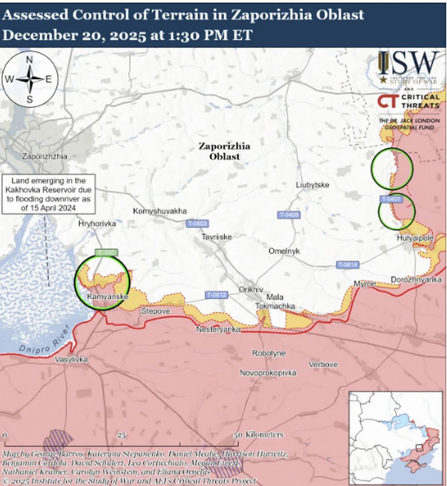 Комментируя ситуацию на западе области (Ореховское направление), в Институте изучения войны констатируют, что украинские войска "недавно продвинулись или удерживают позиции в западной части Запорожской области".