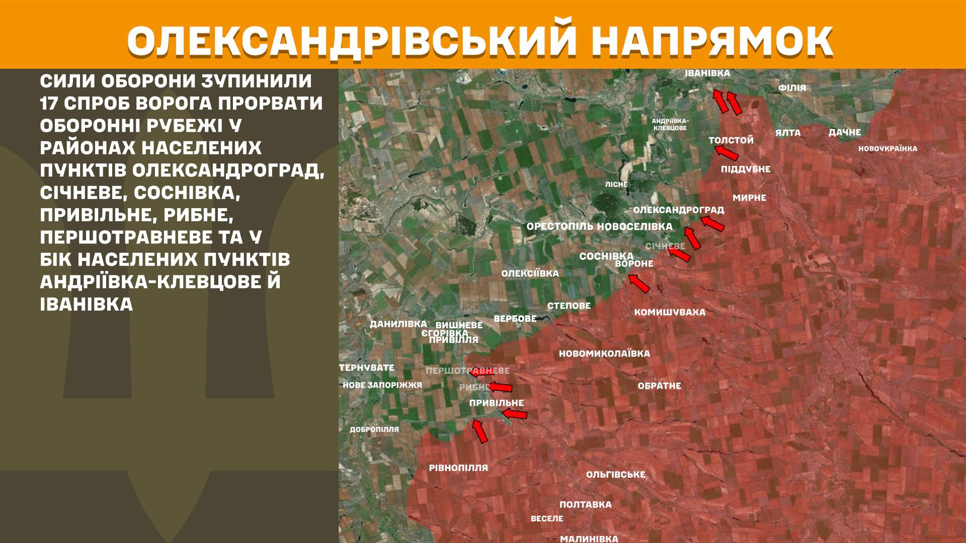 Силы обороны пресекли 17 попыток врага прорвать оборонительные рубежи на Александровском направлении, в том числе в районах Привольного и Рыбного Запорожской области.