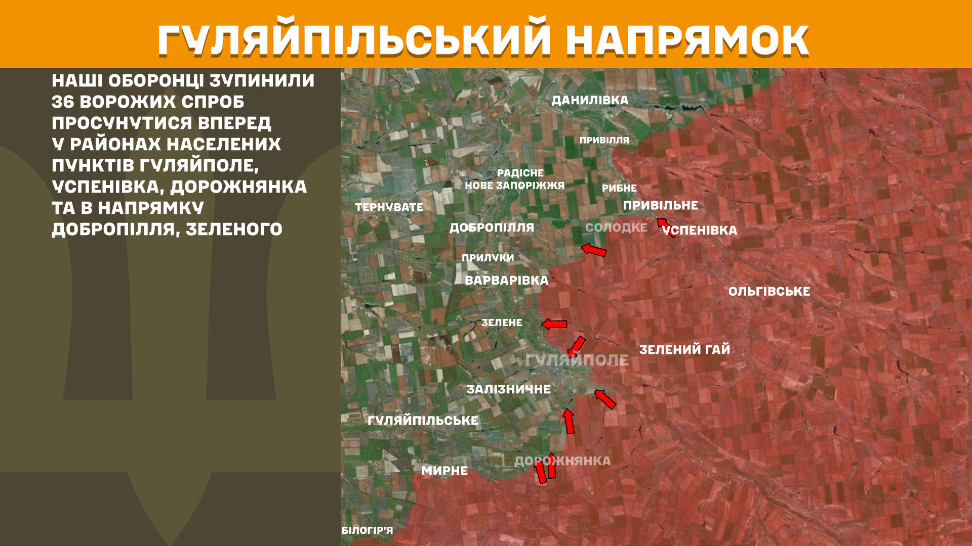 На Гуляйпольском направлении украинские защитники пресекли 36 вражеских попыток продвинуться в районах Гуляйполя, Успеновки, Дорожнянки и в направлении Доброполья, Зеленого. Для сравнения: на самом горячем направлении фронта – Покровском – защитники остановили 40 штурмовых действий агрессора.