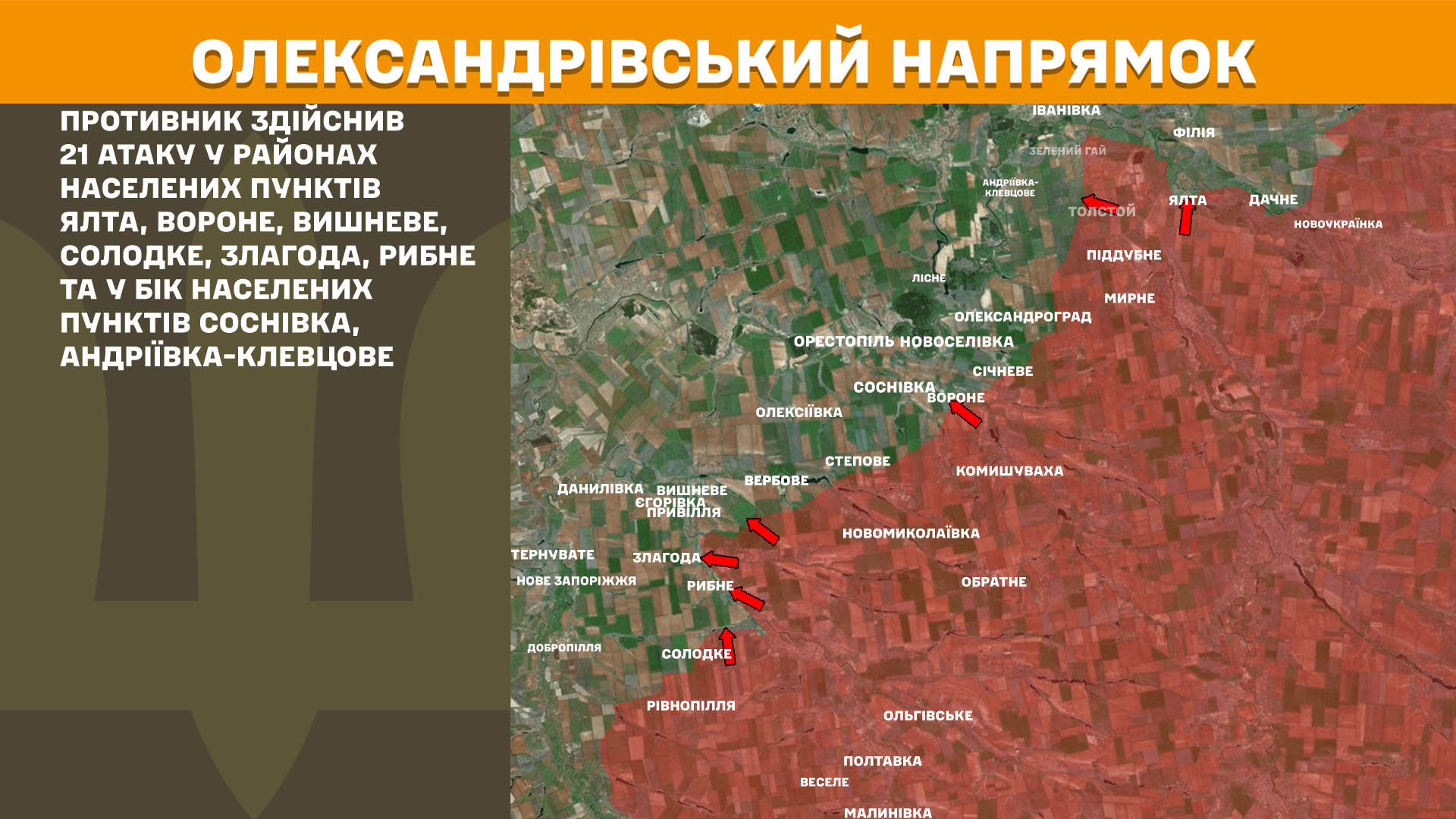В течение суток на стыке областей (Александровское направление) захватчики совершили 21 атаку, в том числе и в районах запорожских сел Солодкое и Рыбное.