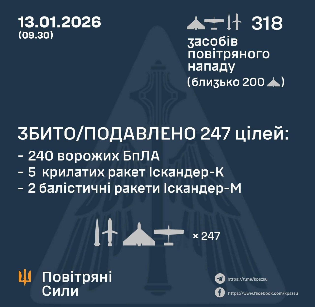В ночь на 13 января РФ атаковала Украину 18 баллистическими/зенитными управляемыми ракетами ("Искандер-М"/"С-300"), семью ракетами "Искандер-К", а также 293 ударными беспилотниками разных типов. Об этом сообщает "Справжнє" со ссылкой на Генштаб ВСУ.