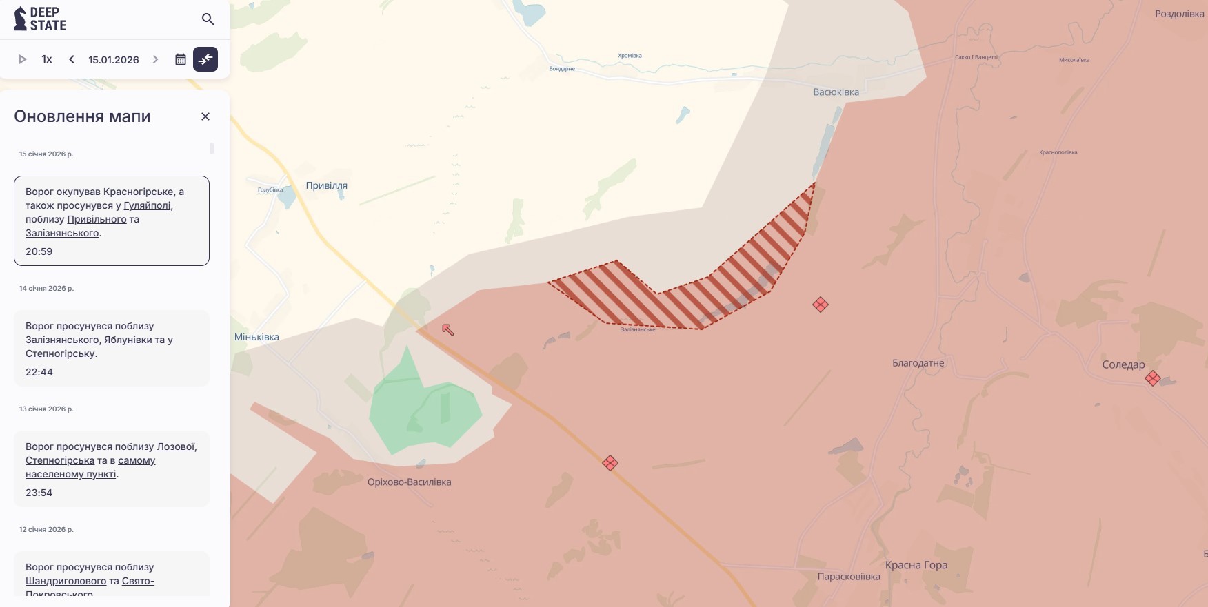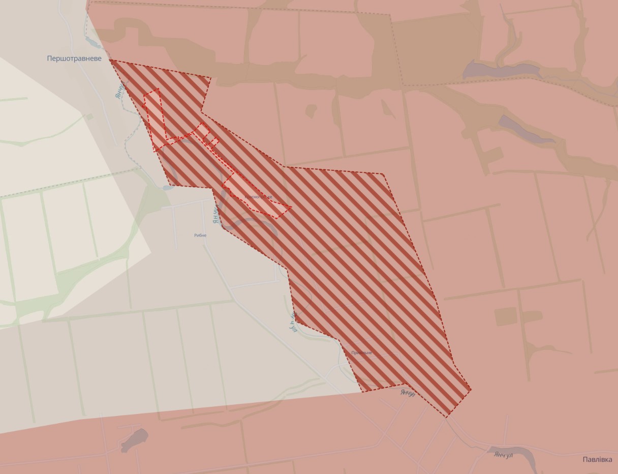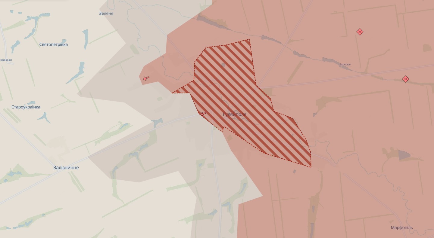 Враг взял под контроль село Красногорское Пологовского района Запорожской области. Также россияне продвинулись в Гуляйполе и возле Привольного. Такие обновления на карте боевых действий обозначил аналитический проект DeepState, передает "Справжнє".