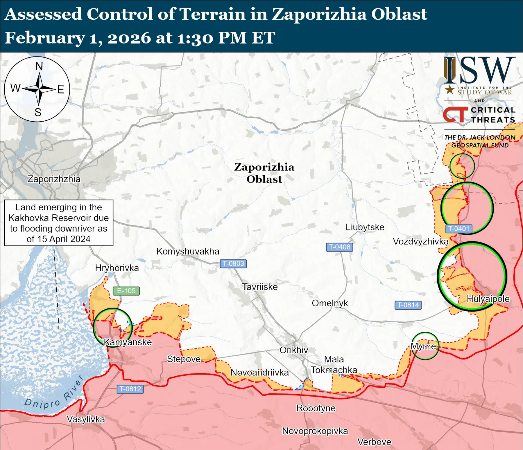 По оценке ISW, 31 января и 1 февраля на Ореховском направлении российские захватчики наступали в районе Степногорска, Плавней, Павловки, Приморского, Речного, Новояковлевки и Новобойковского.