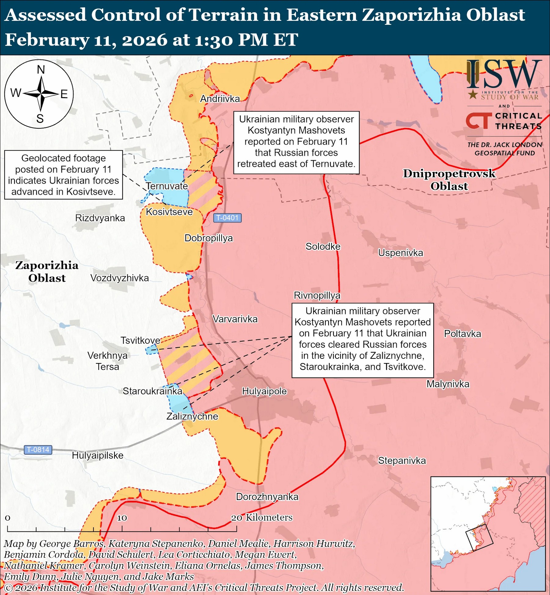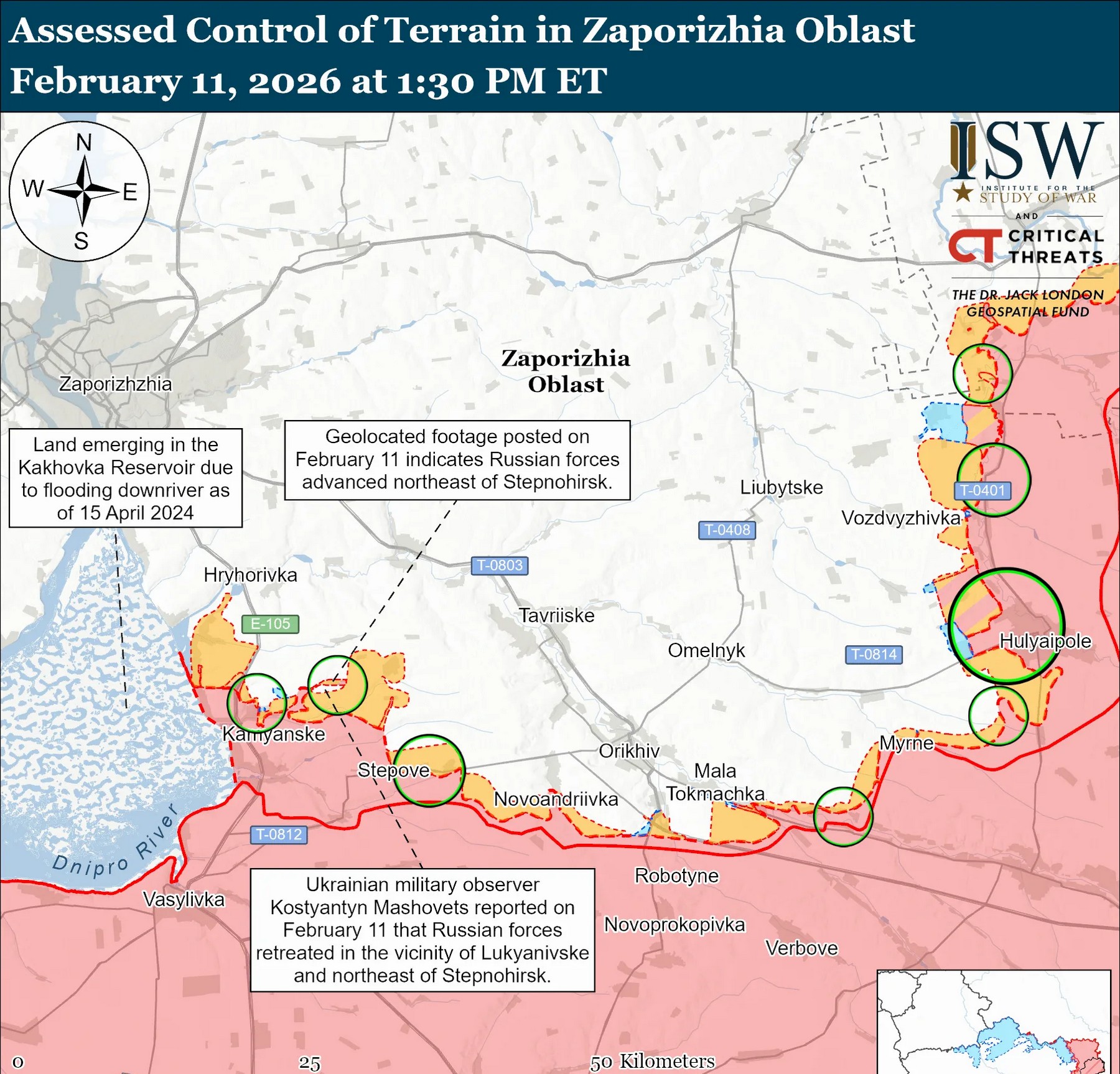 По оценкам ISW, на востоке Запорожской области 10 и 11 февраля оккупанты атаковали вблизи Гуляйполя. Также россияне безуспешно пытались продвинуться в районе Цветкового, Прилук, Доброполья, Варваровки, Злагоды, Рыбного, Дорожнянки и Железнодорожного.