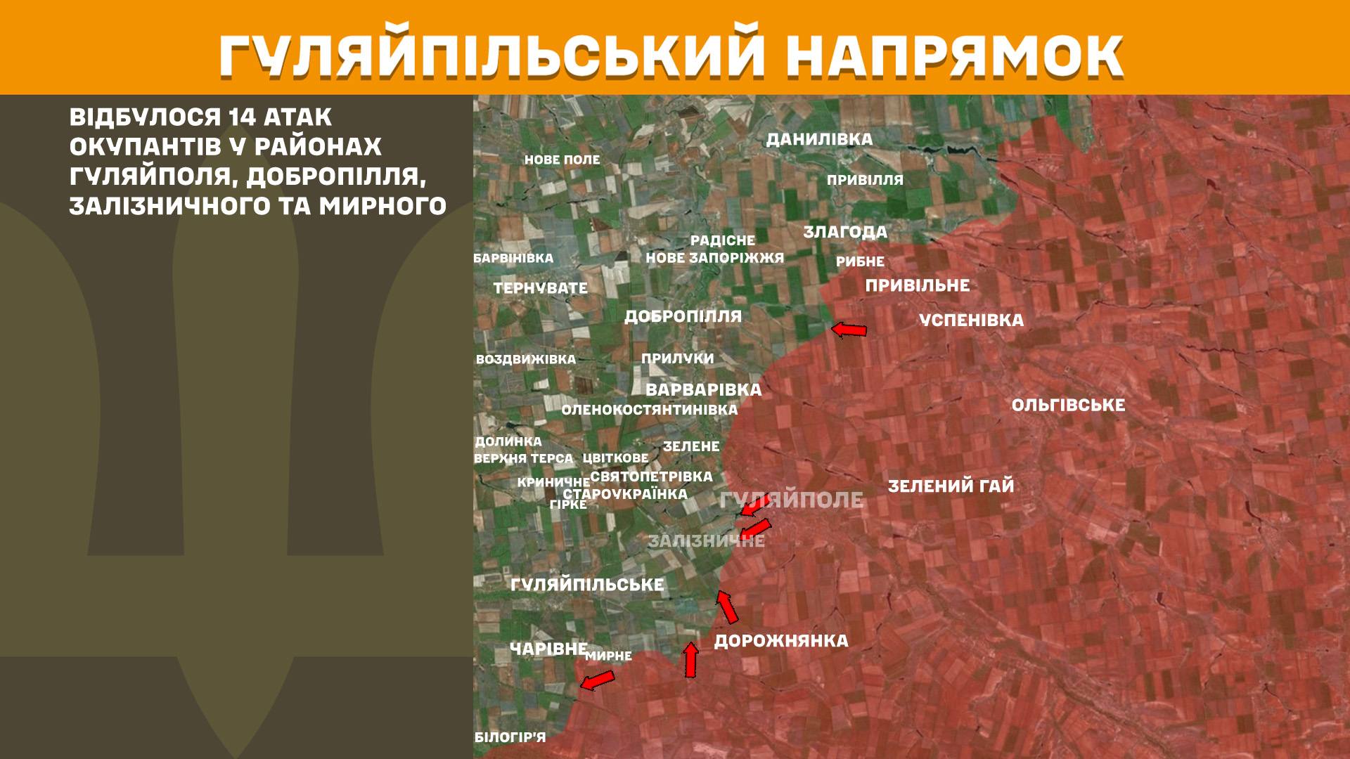 На Гуляйпольском направлении произошло 14 атак оккупантов в районах Гуляйполя, Доброполья, Зализничного и Мирного.