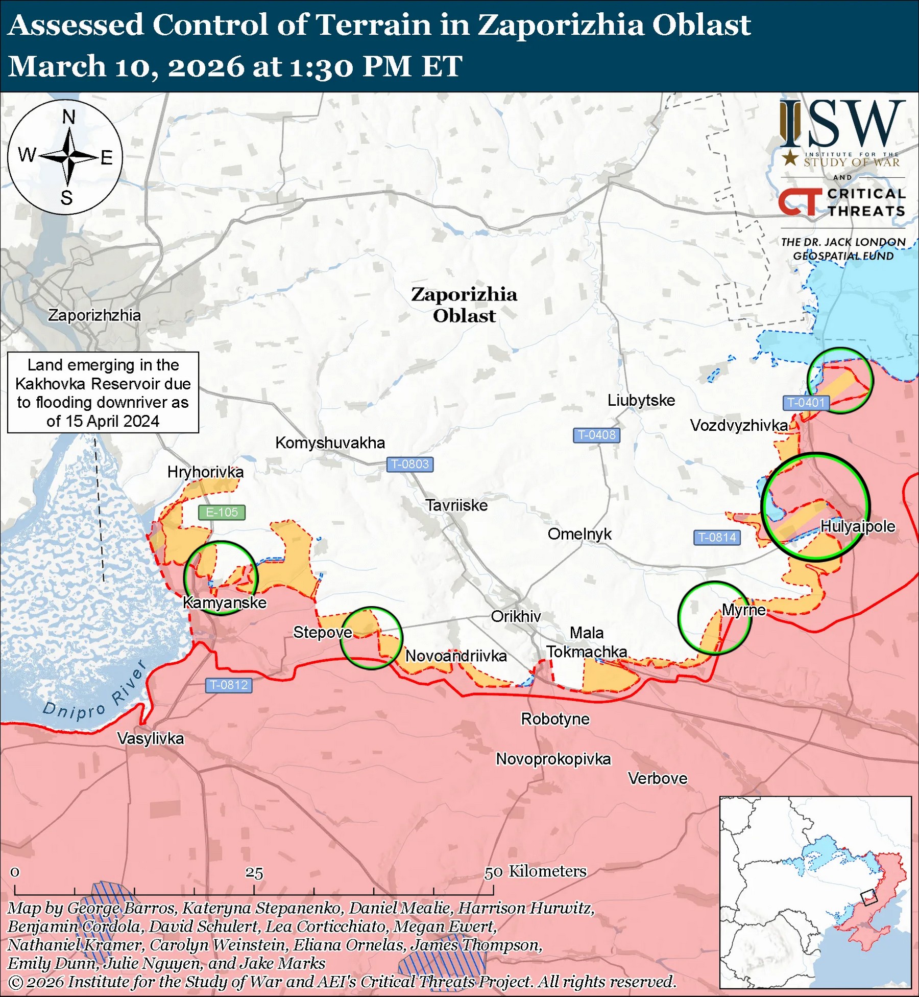 По данным американских экспертов, 10 марта российские войска продолжили наступательные операции и на Ореховском направлении, но не продвинулись вперед. Захватчики атаковали вблизи Приморского, Степногорска, Павловки, Магдалиновки, Луговского и Щербаков.