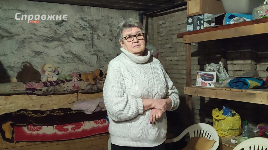 "Колись тут зберігали вугілля – ви ж бачите, стіни ще темні від нього. Тому що раніше цей будинок мав пічне опалення. А сьогодні це – моє укриття. Не можу сказати, що часто ним користуюсь, але коли летить поруч, то спускаюсь”, – каже жінка.
