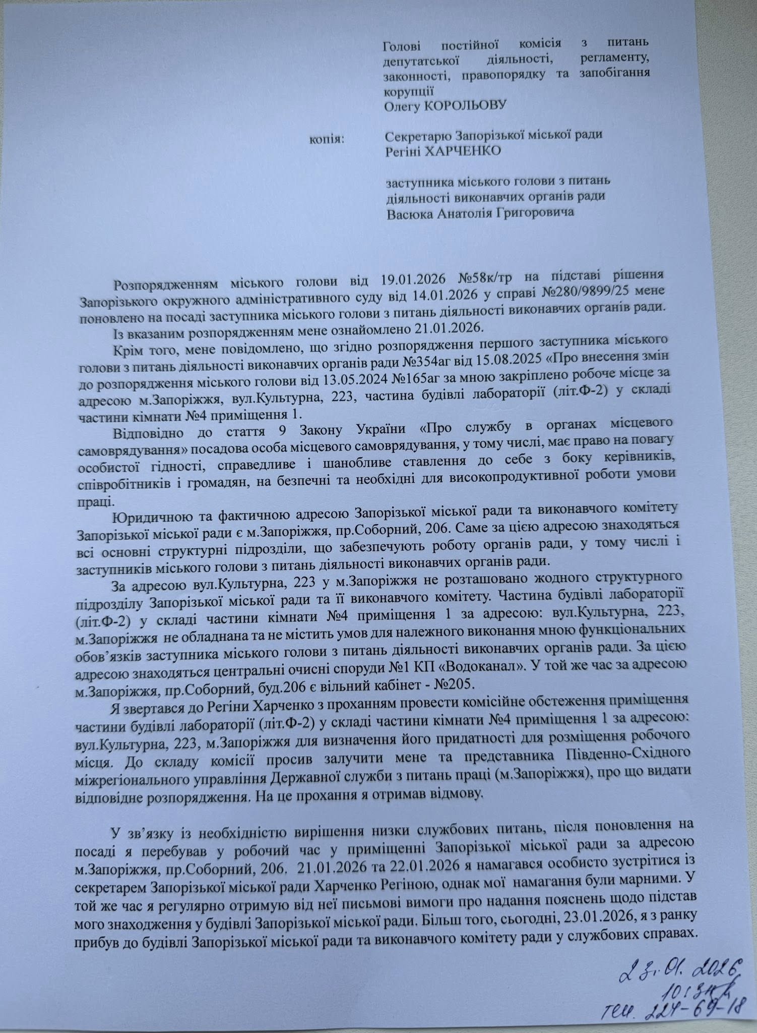 У зв’язку з цим, Анатолій Васюк подав офіційне звернення до профільної комісії та секретаря Запорізької міської ради Регіни Харченко, в якому він зазначає, що приміщення в будівлі Водоканалу не обладнане для роботи заступника міського голови.