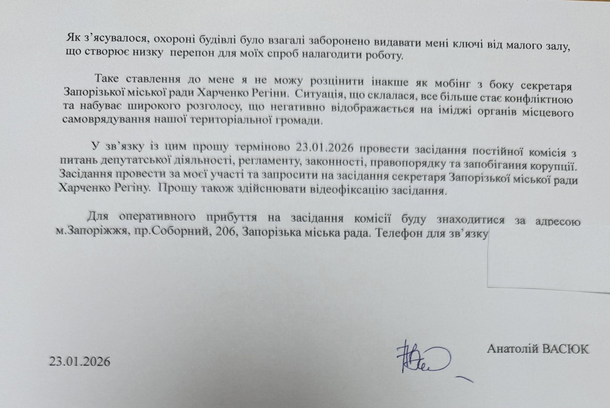 В своєму офіційному зверненні Анатолій Васюк вимагає від профільної депутатської комісії з питань законності та регламенту провести засідання за участю обох сторін та з обов'язковою відеофіксацією, щоб зупинити конфлікт, який псує імідж міської влади Запоріжжя.
