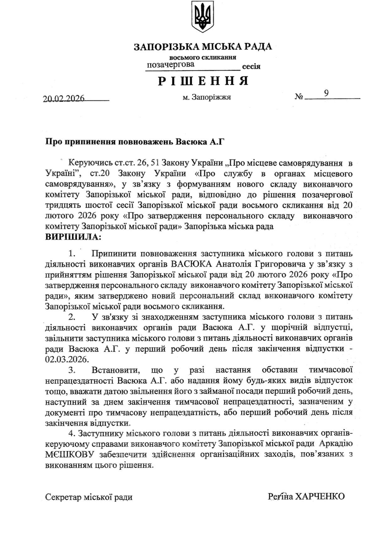 На позачерговій сесії міськради запорізькі депутати ухвалили рішення втретє звільнити заступника міського голови Анатолія Васюка, який вже двічі поновлювався на посаді через суд. Про це інформує "Справжнє" з посиланням на відповідне рішення виконкому.