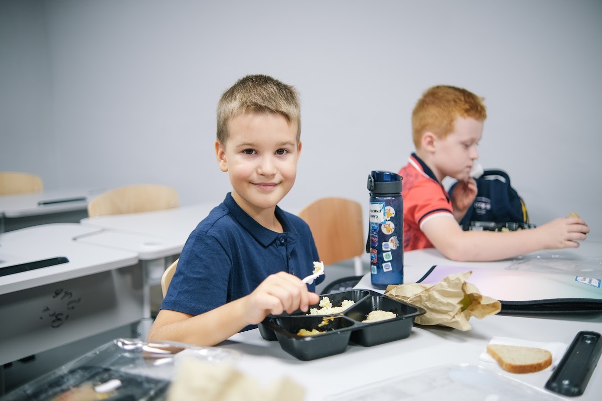 Всіх дітей у школі годують безоплатним гарячим харчуванням, організованим за допомогою кейтерингу. Всі страви смачні, корисні й збалансовані.