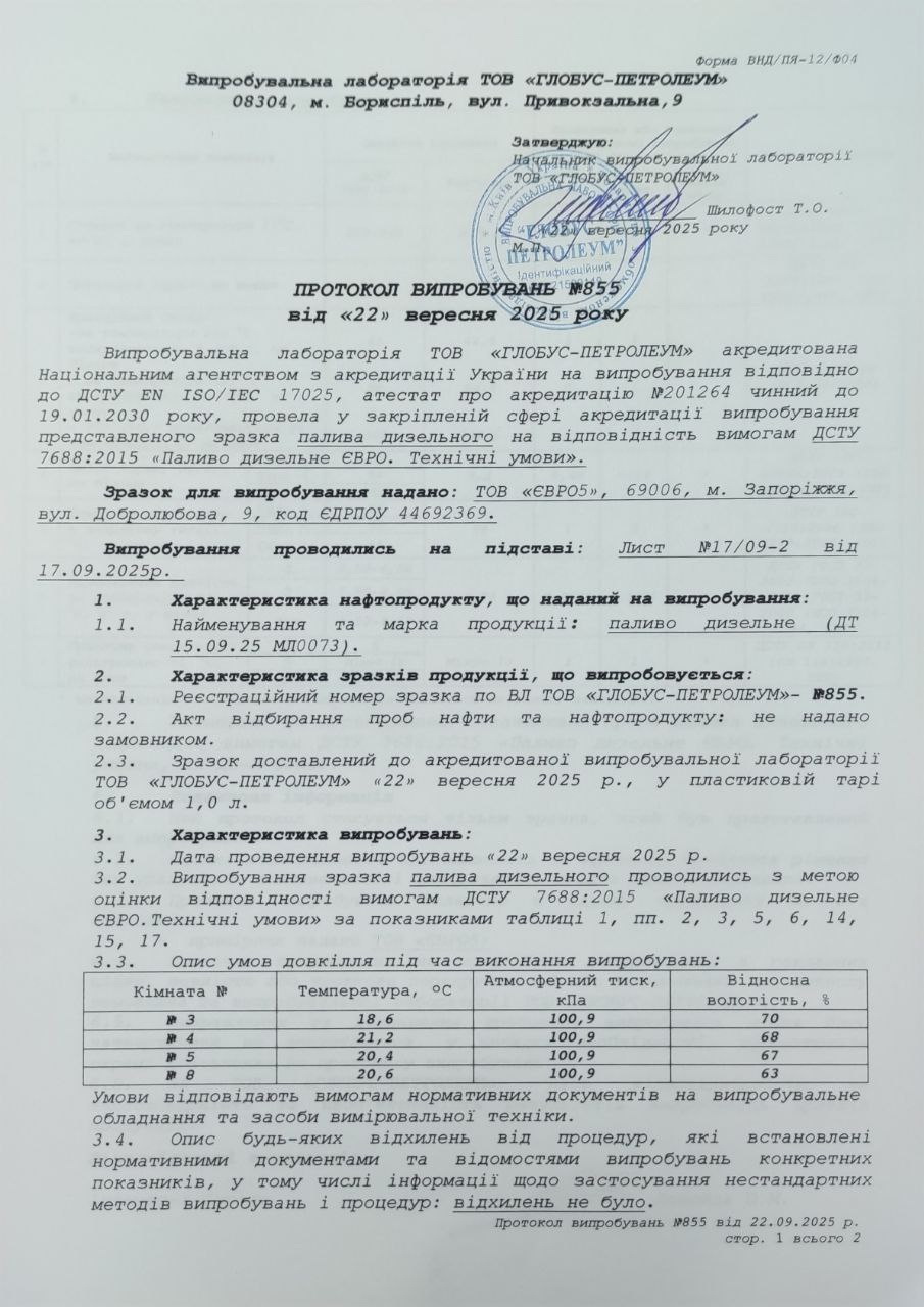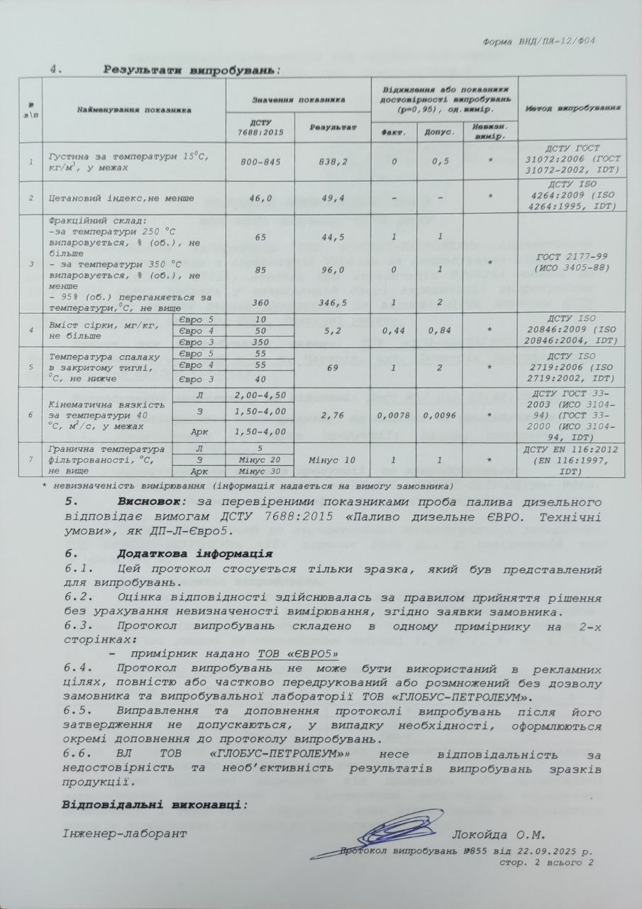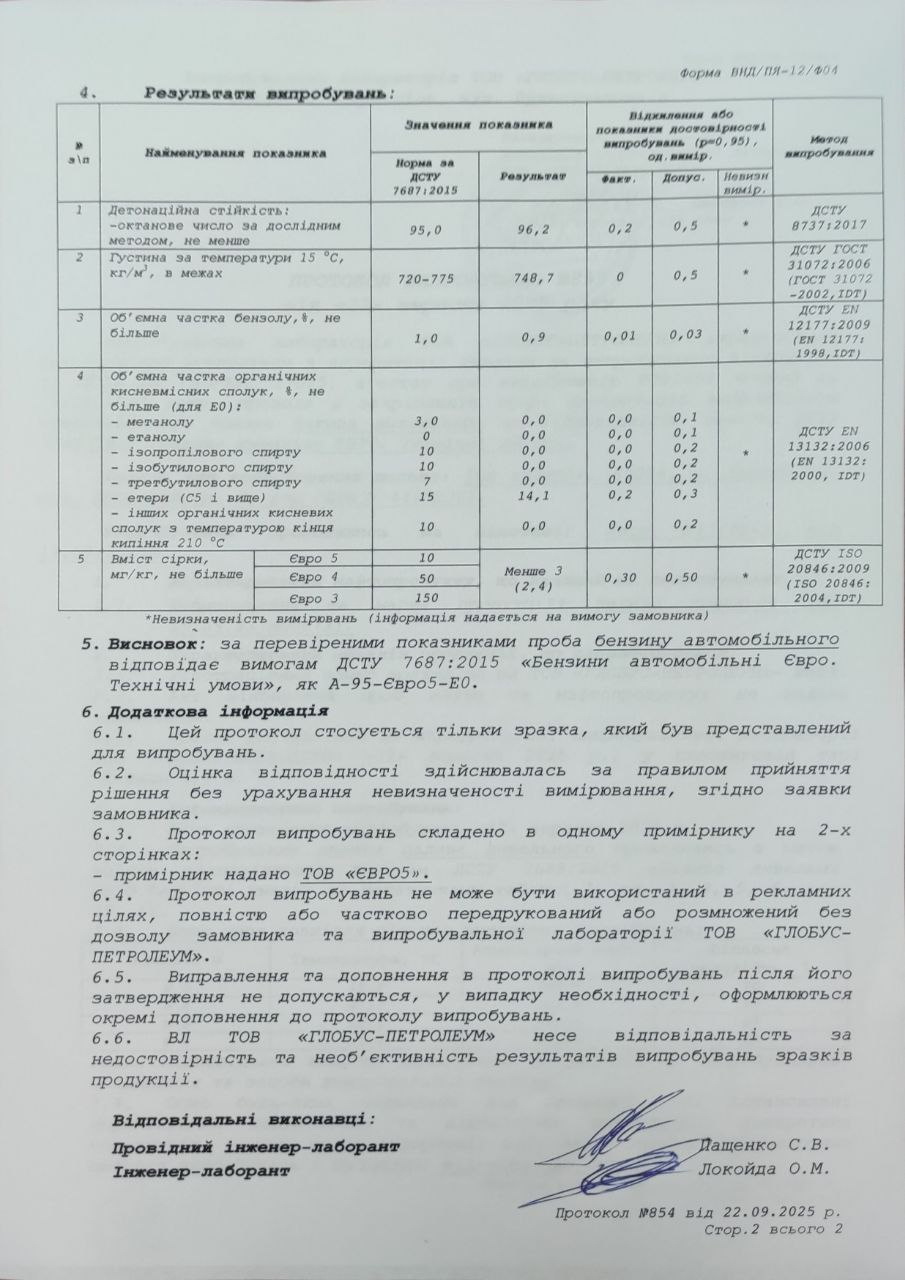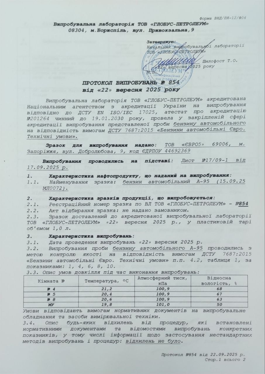 Згідно з протоколами від 22 вересня 2025 року, обидва зразки відповідають чинним державним стандартам України. Зокрема, бензин А-95 повністю відповідає вимогам ДСТУ 7687:2015 "Бензини автомобільні Євро. Технічні вимоги" як бензин А-95-Євро5-Е0, а дизельне пальне відповідає вимогам ДСТУ 7688:2015 "Паливо дизельне ЄВРО. Технічні вимоги" як ДП-Л-Євро5.