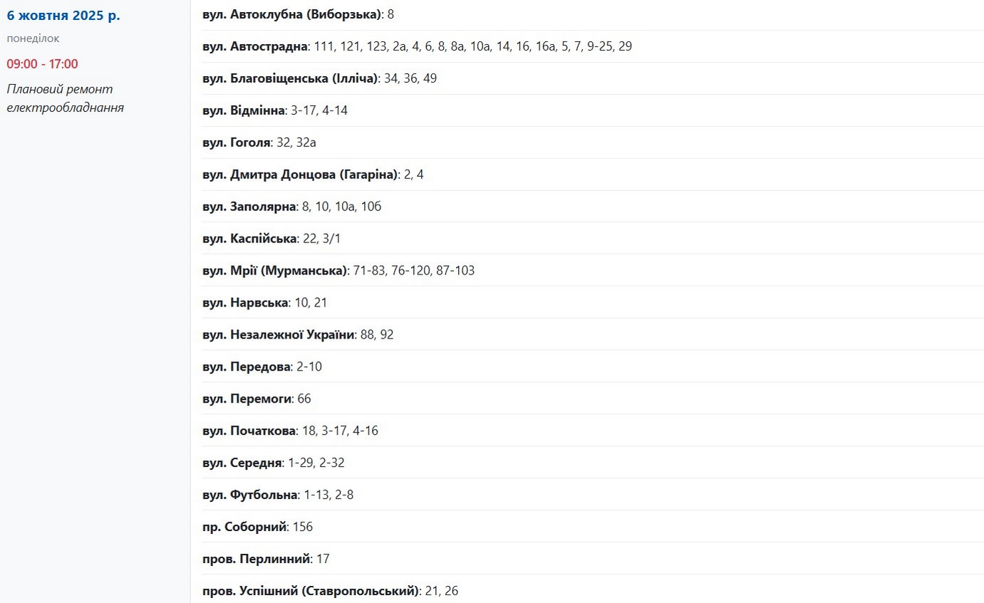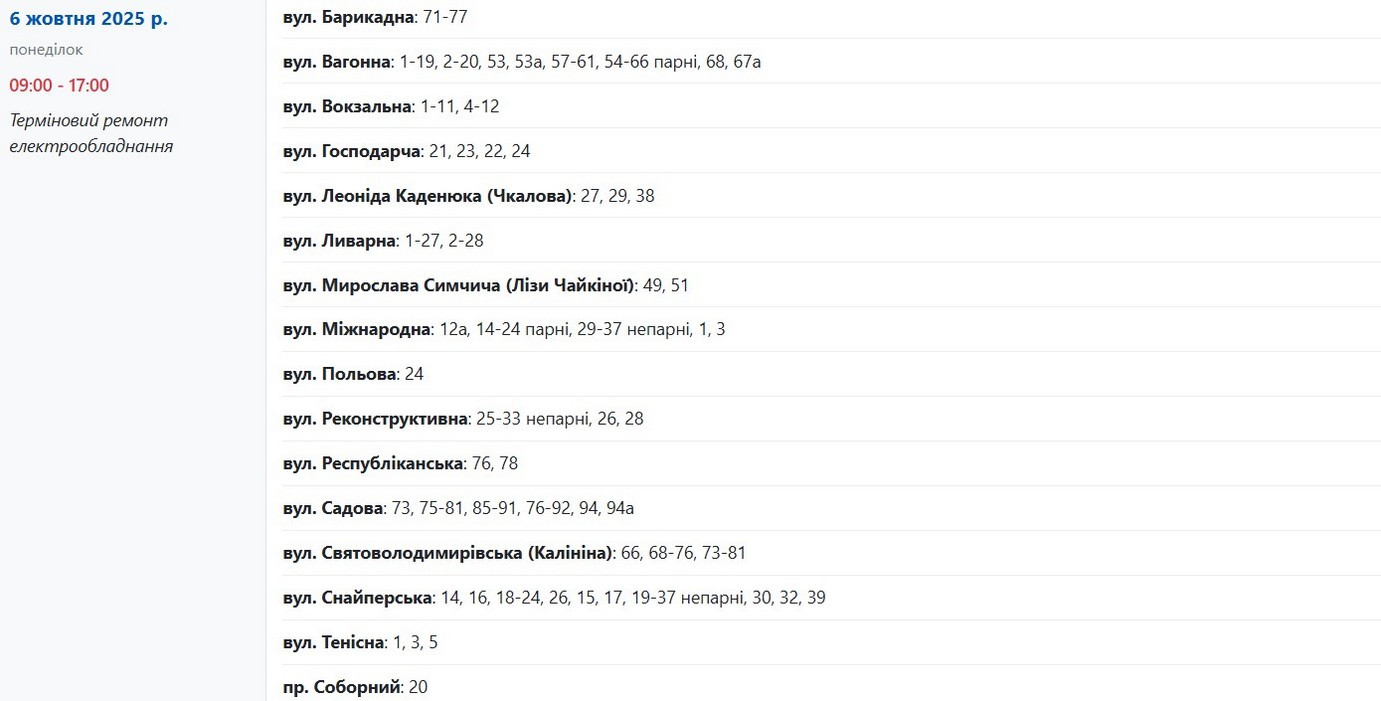 Із 09:00 до 17:00 електрики не буде за наступними адресами:
