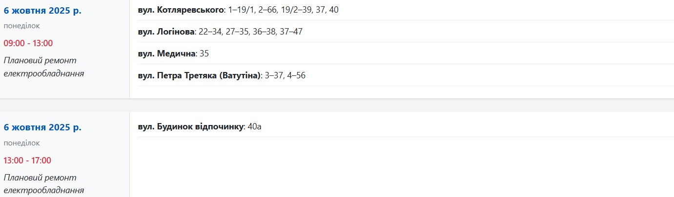 Крім того, з 09:00 до 13:00 та з 13:00 до 17:00 світло вимкнуть за адресами: