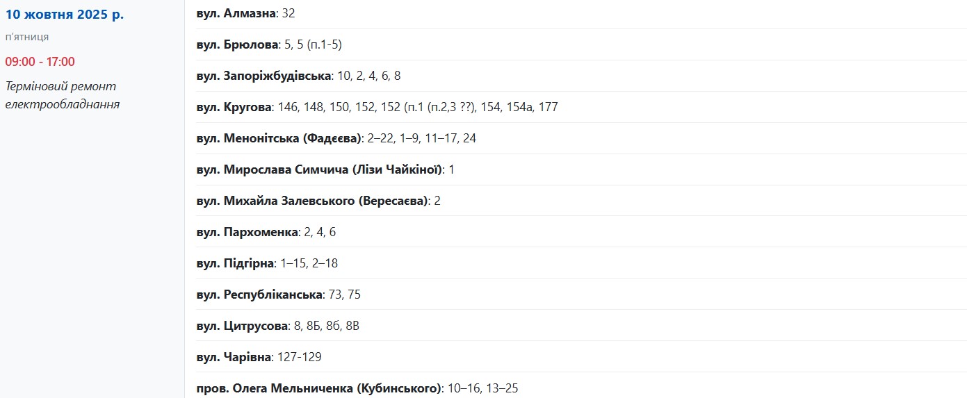 У пʼятницю, 10 жовтня, понад 50 вулиць у Запоріжжі тимчасово залишаться без електропостачання. Про це повідомляє "Справжнє" з посиланням на Запоріжжяобленерго.