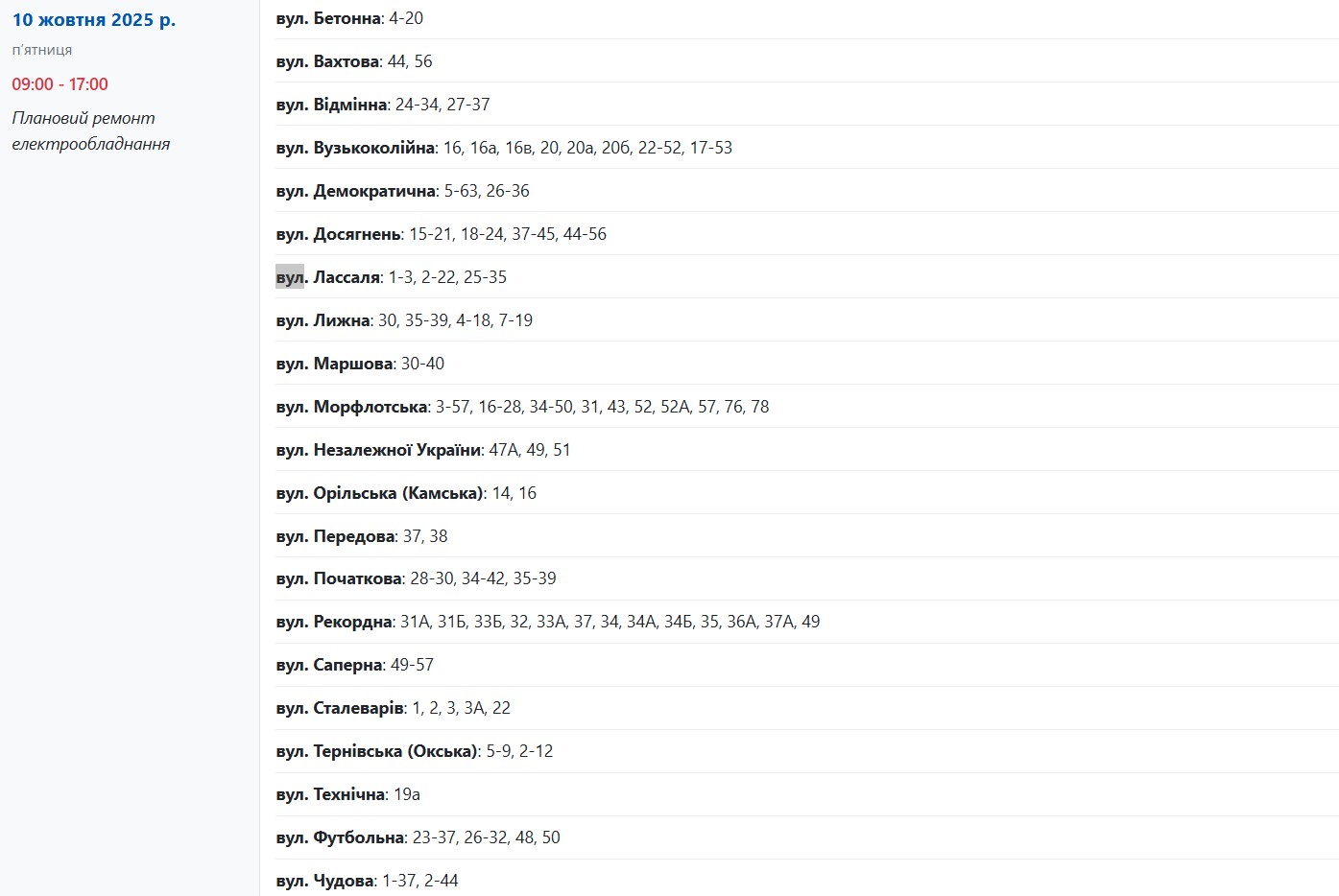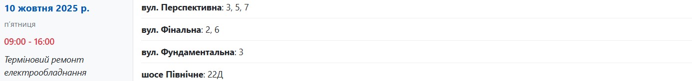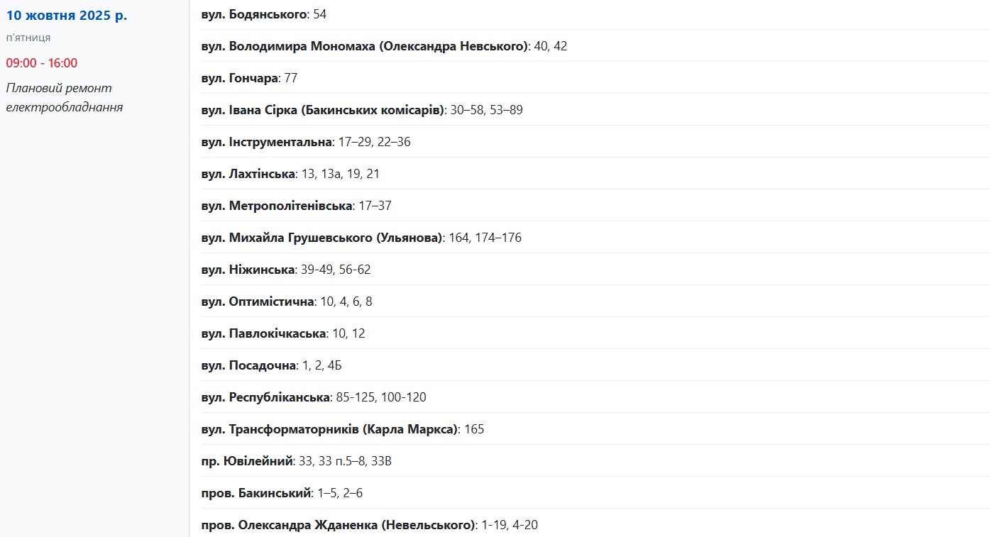 Із 09:00 до 16:00 світло вимкнуть за адресами: