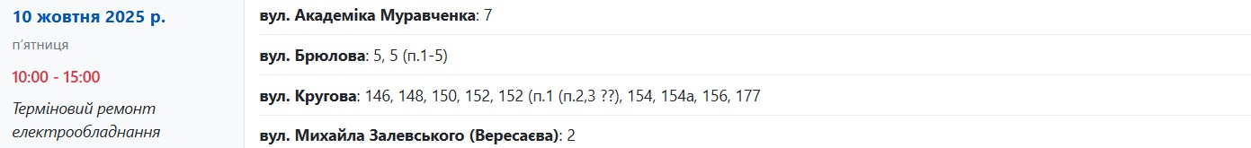Крім того, з 10:00 до 15:00 через терміновий ремонт електрообладнання електрики не буде у таких будинках: