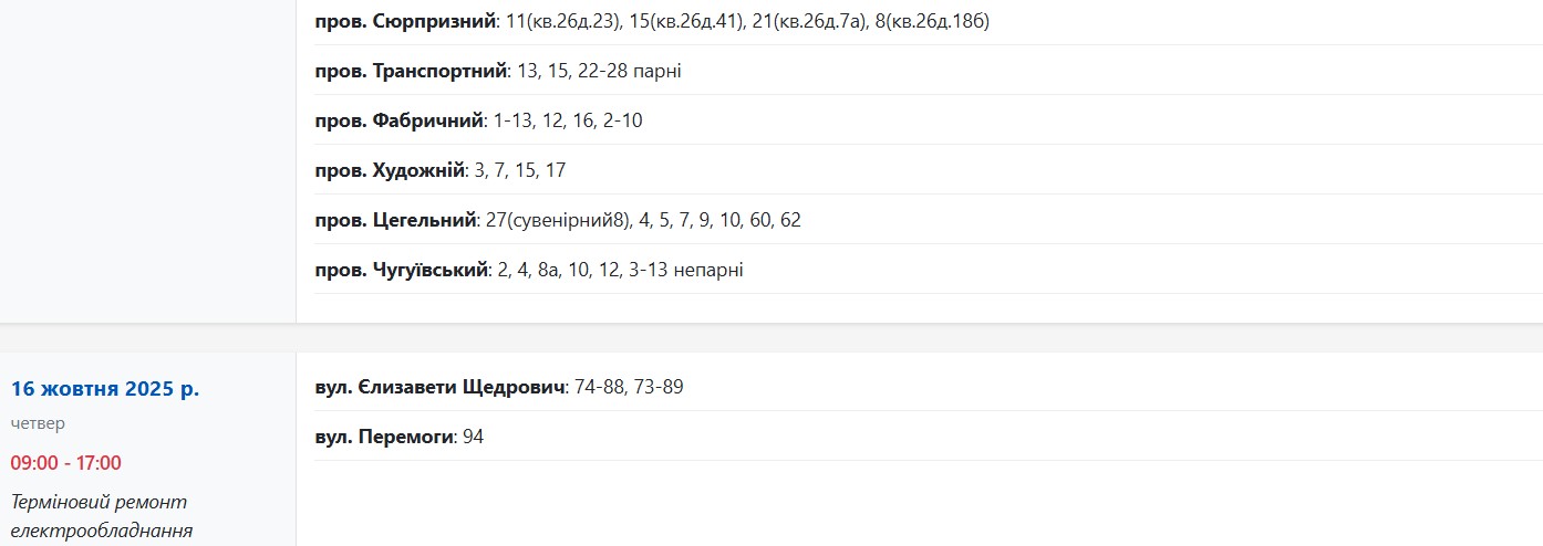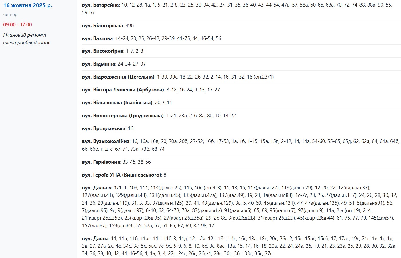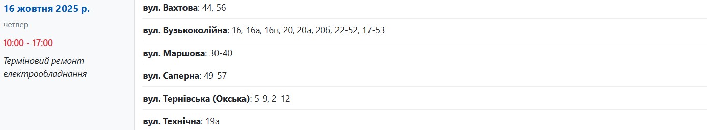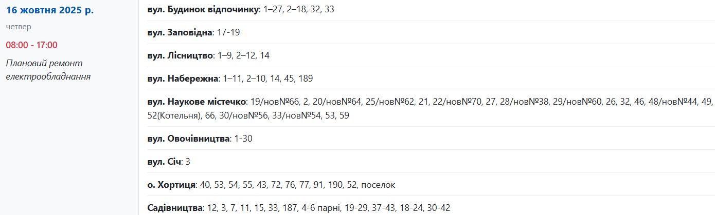 Із 08:00 до 17:00 через плановий ремонт електрообладнання світла не буде за адресами: