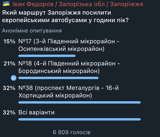Поки що лідирують маршрут, що з'єднує проспект Металургів з Хортицьким районом, та варіант запуску додаткових автобусів за усіма маршрутами.