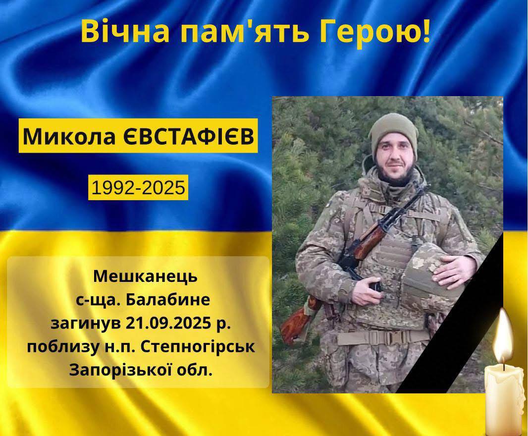 21 вересня 2025 року Микола Євстафієв загинув у бою в районі Степногірська на Запорізькому напрямку.