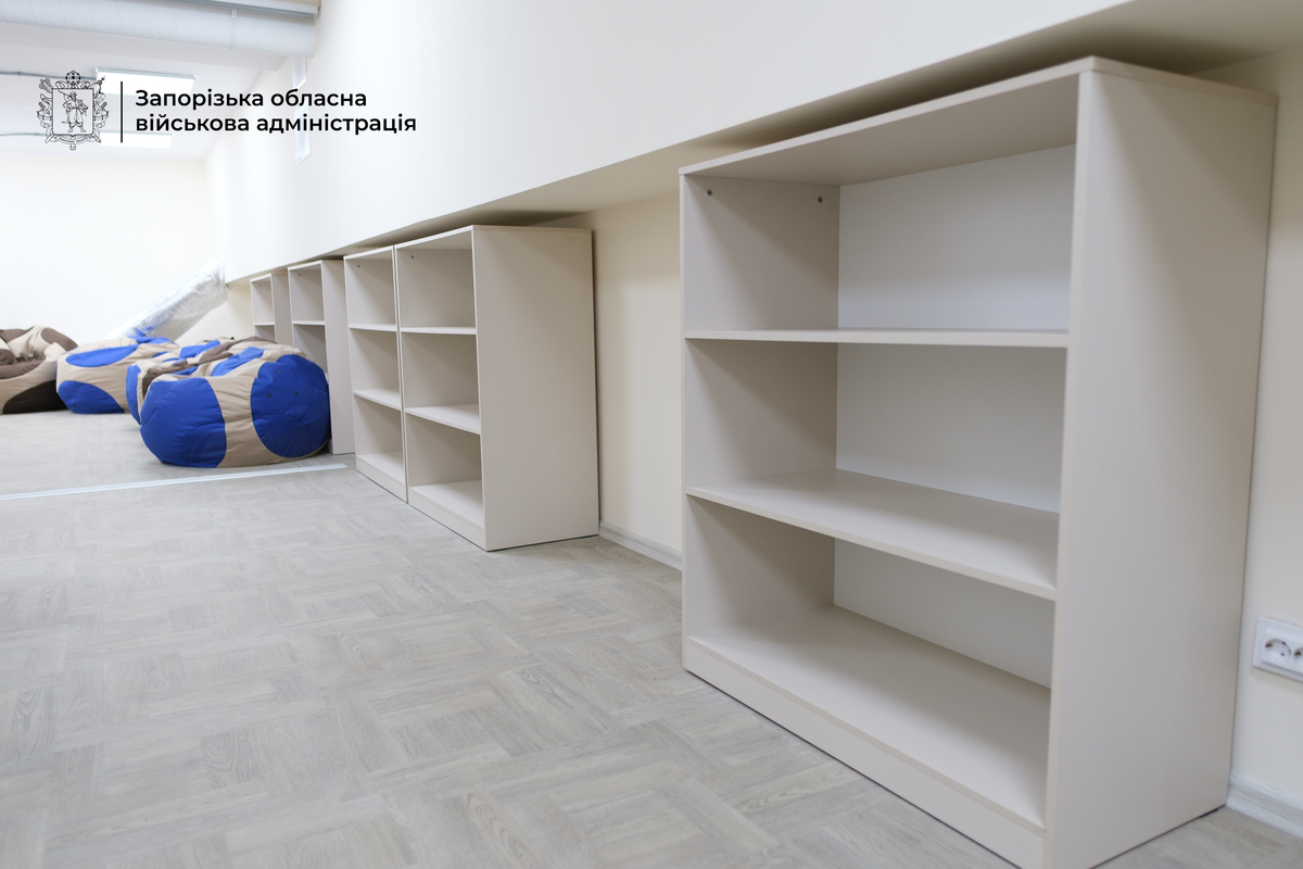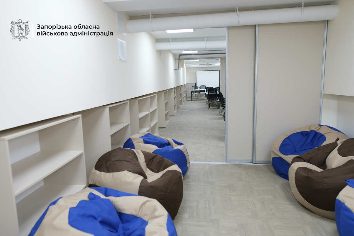Приміщення укриття поділили на три зони, які облаштували зручними меблями, місцями для групових занять, м’якими пуфами для відпочинку. Також у безпечному просторі провели інтернет.
