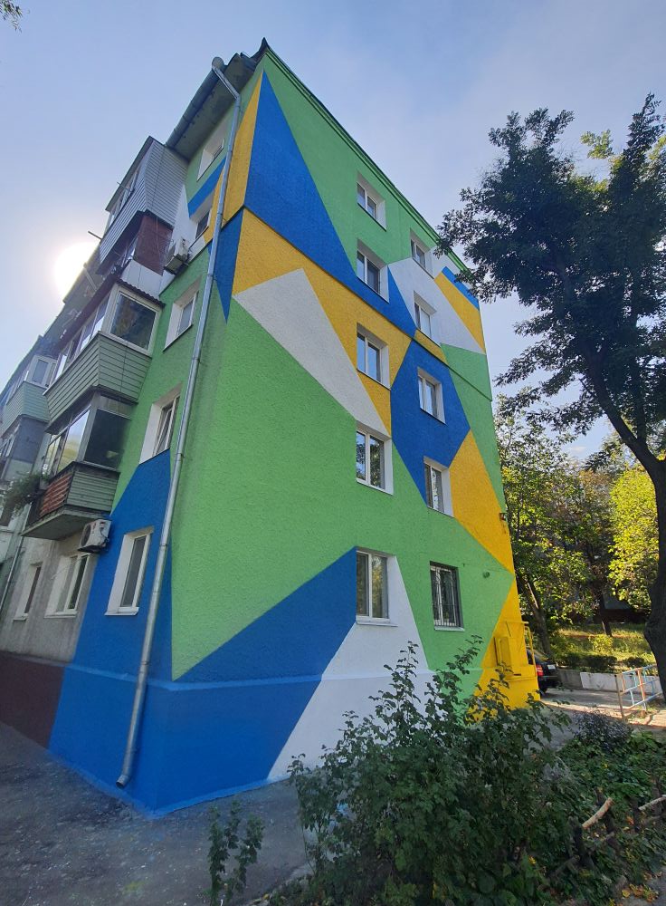 Над створенням стінопису працювала ціла команда майстрів. Яскраві абстрактні фігури, зображені на фасаді п’ятиповерхівки, стали так званим символом оновлення міста, певним містком між минулим та майбутнім.