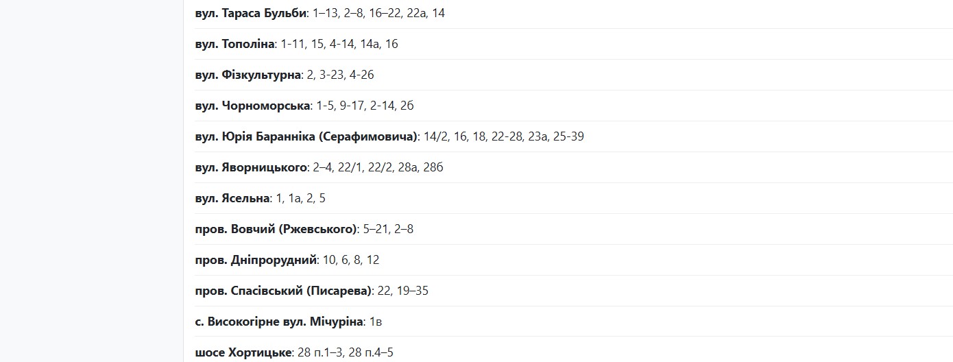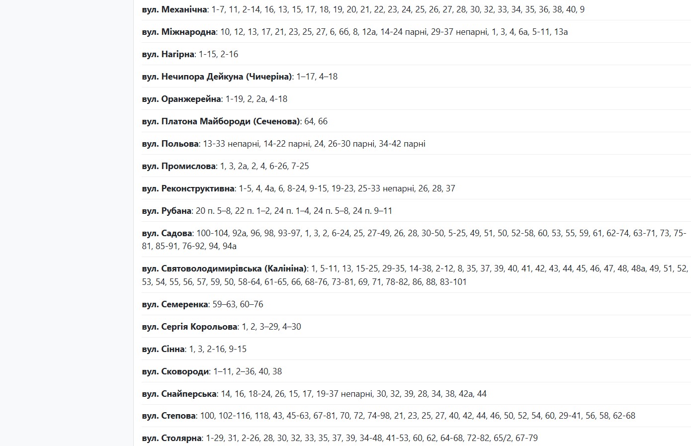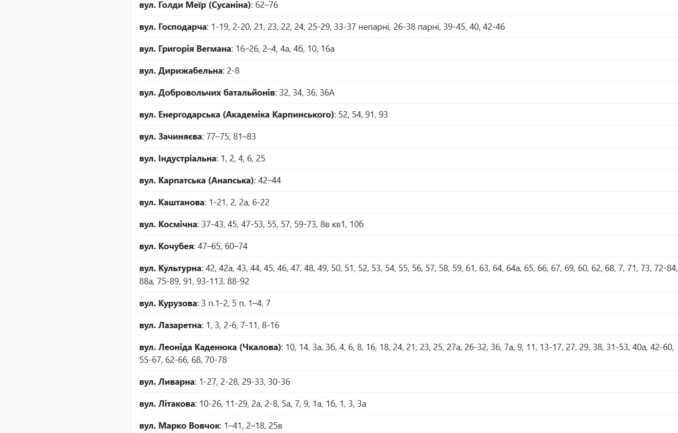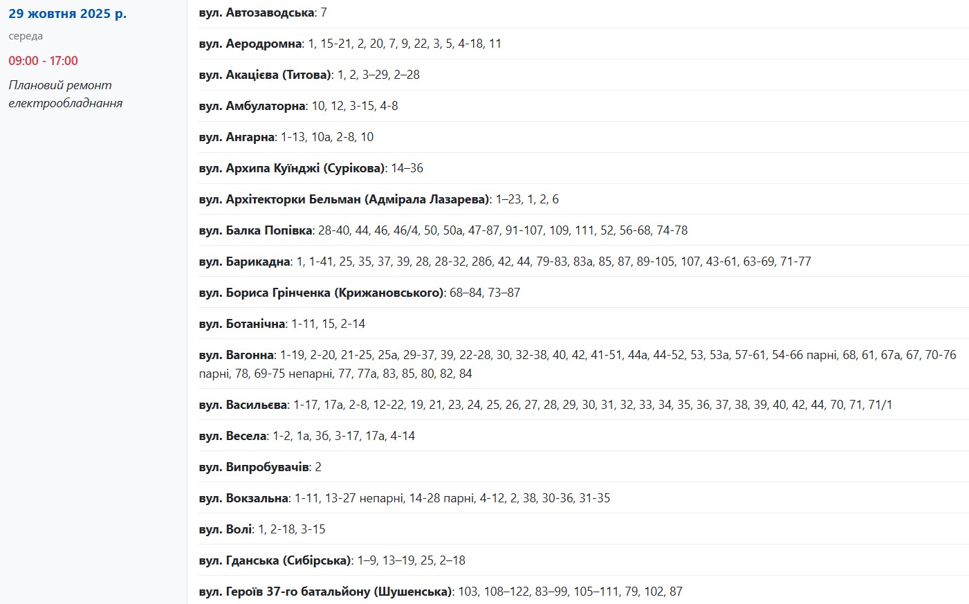 За інформацією енергетиків, із 09:00 до 17:00 через плановий ремонт електрообладнання відключення заплановані за такими адресами: