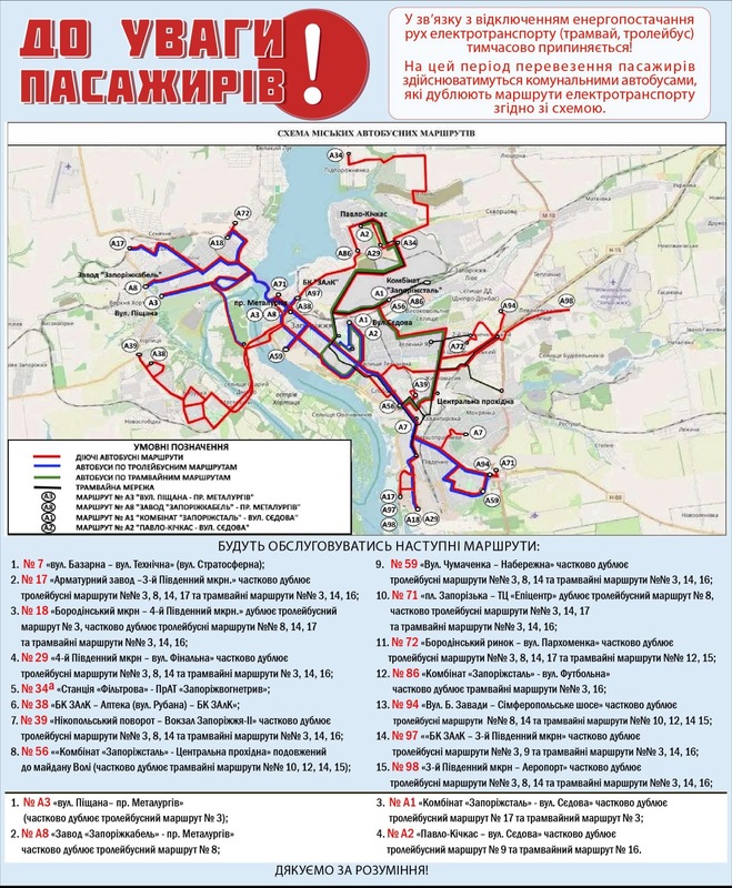 Під час знеструмлень у Запоріжжі частина тролейбусів і трамваїв тимчасово призупиняються. Для того, щоб містяни змогли дістатися місць роботи, навчання, тощо, міські автобуси будуть дублювати електротранспорт, передає "Справжнє" з посиланням на Запорізьку ОВА.