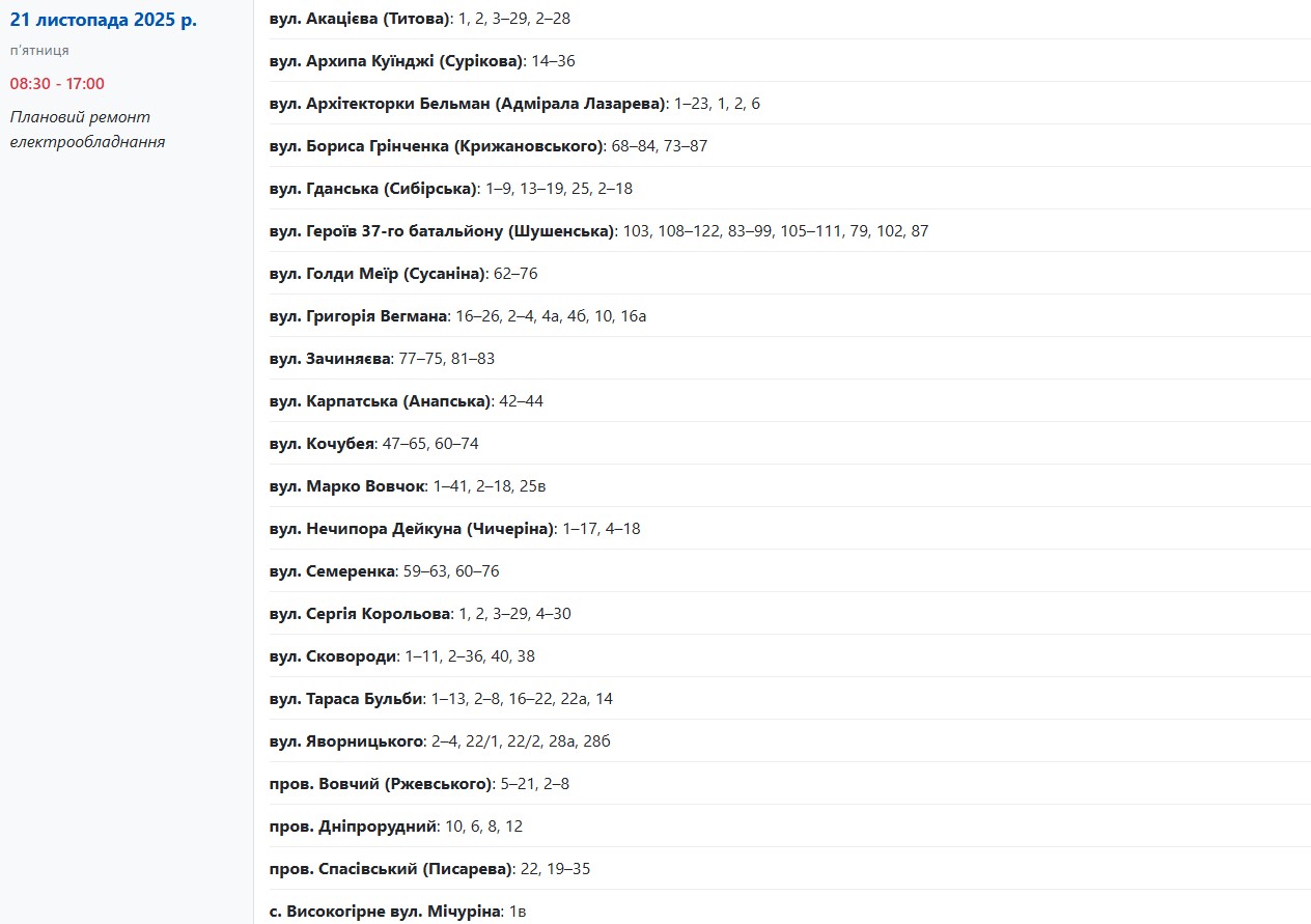 За даними енергетиків, із 08:30 до 17:00 електрики не буде у споживачів, які мешкають за адресами: