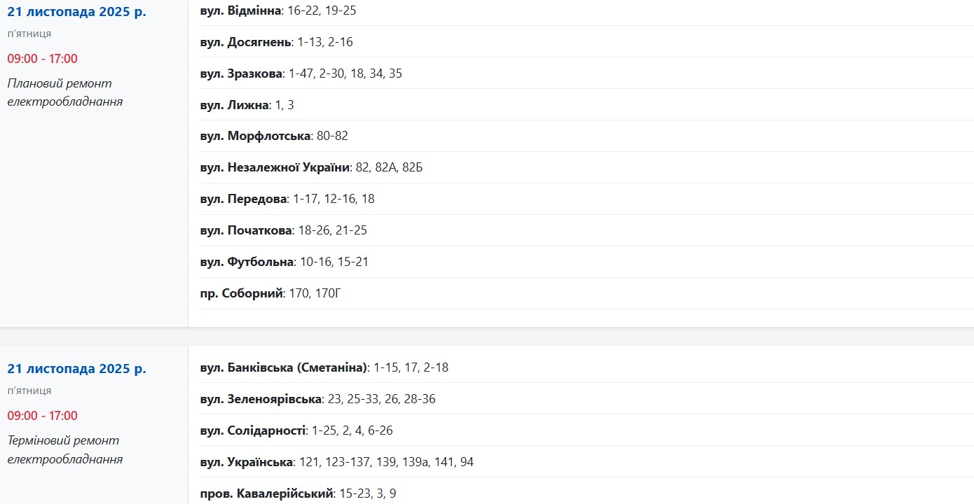 Також із 09:00 до 17:00 світло вимикатимуть через плановий і терміновий ремонт електрообладнання на наступних вулицях: