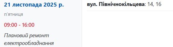 Окрім того, у двох будинках електрику вимикатимуть із 09:00 до 16:00: