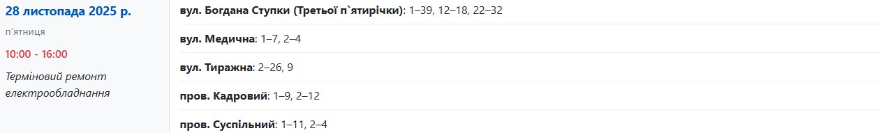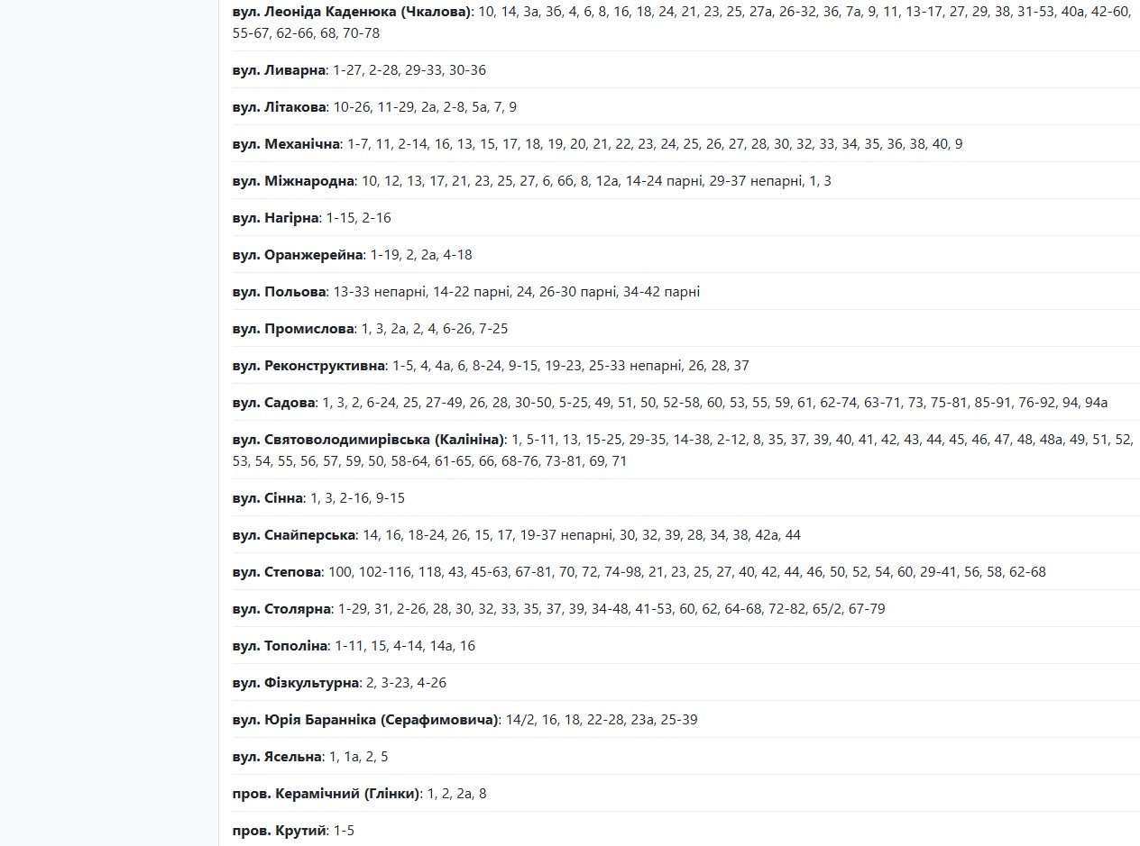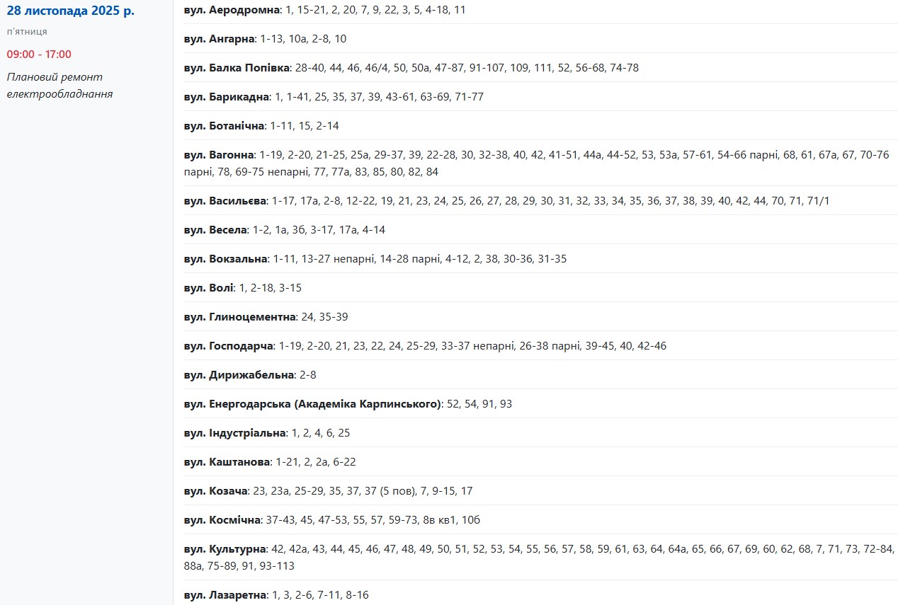 Також із 09:00 до 17:00 світло вимикатимуть через плановий і терміновий ремонт електрообладнання на наступних вулицях: