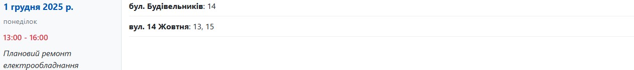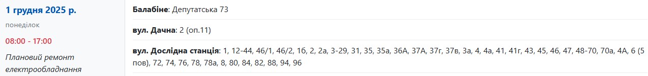 Окрім того, з 10:00 до 16:00 знеструмлять мешканців, які проживають за адресами: