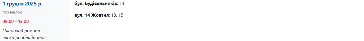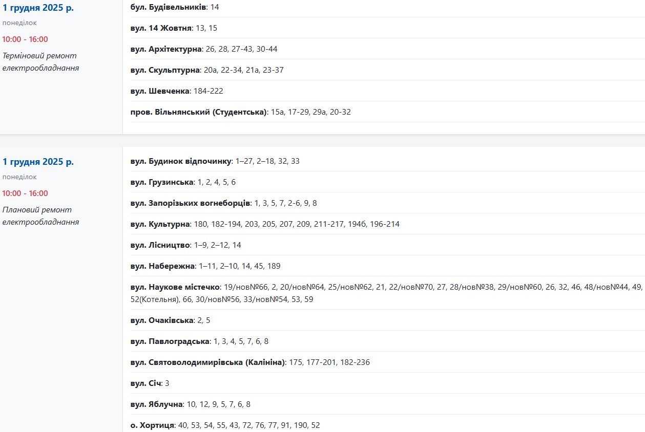 Зазначається, що з 08:00 до 17:00 плановий ремонт електрообладнання проводитимуть за наступними адресами:
