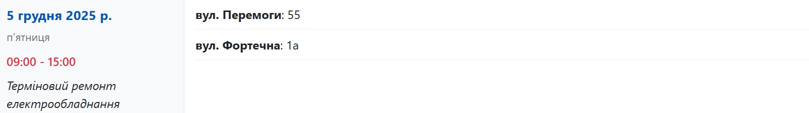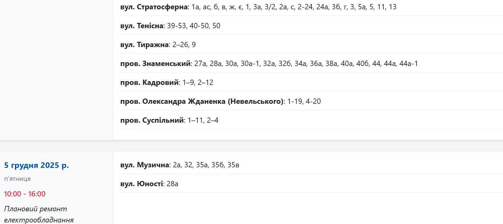 За даними енергетиків, із 09:00 до 15:00 електрики не буде у споживачів, які мешкають за адресами: