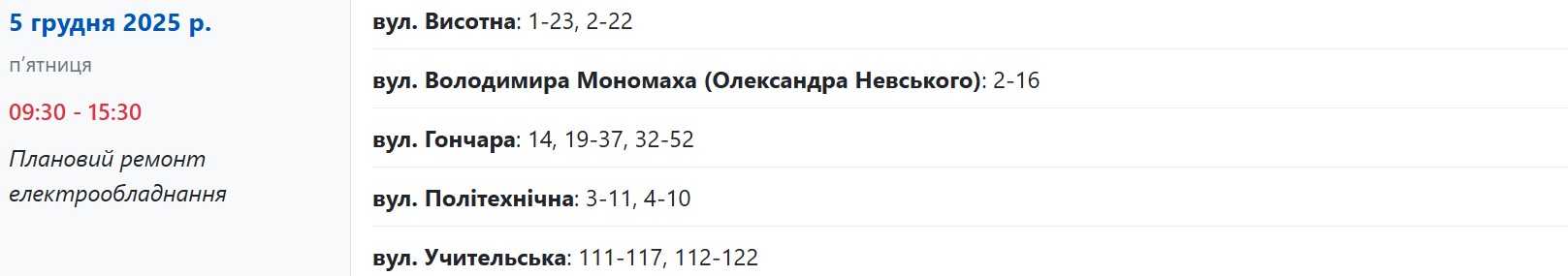 Також із 09:30 до 15:30 світло вимикатимуть через плановий ремонт у наступних будинках:
