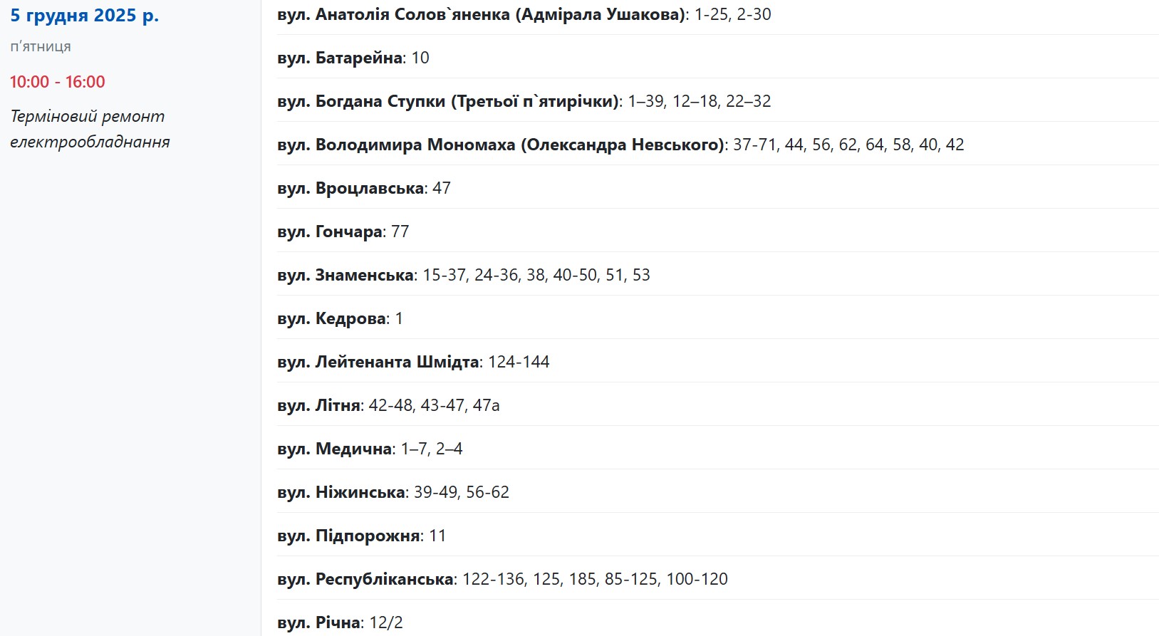 Окрім того, понад два десятки вулиць сьогодні знеструмлять із 10:00 до 16:00: