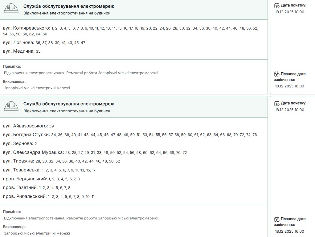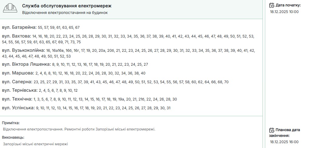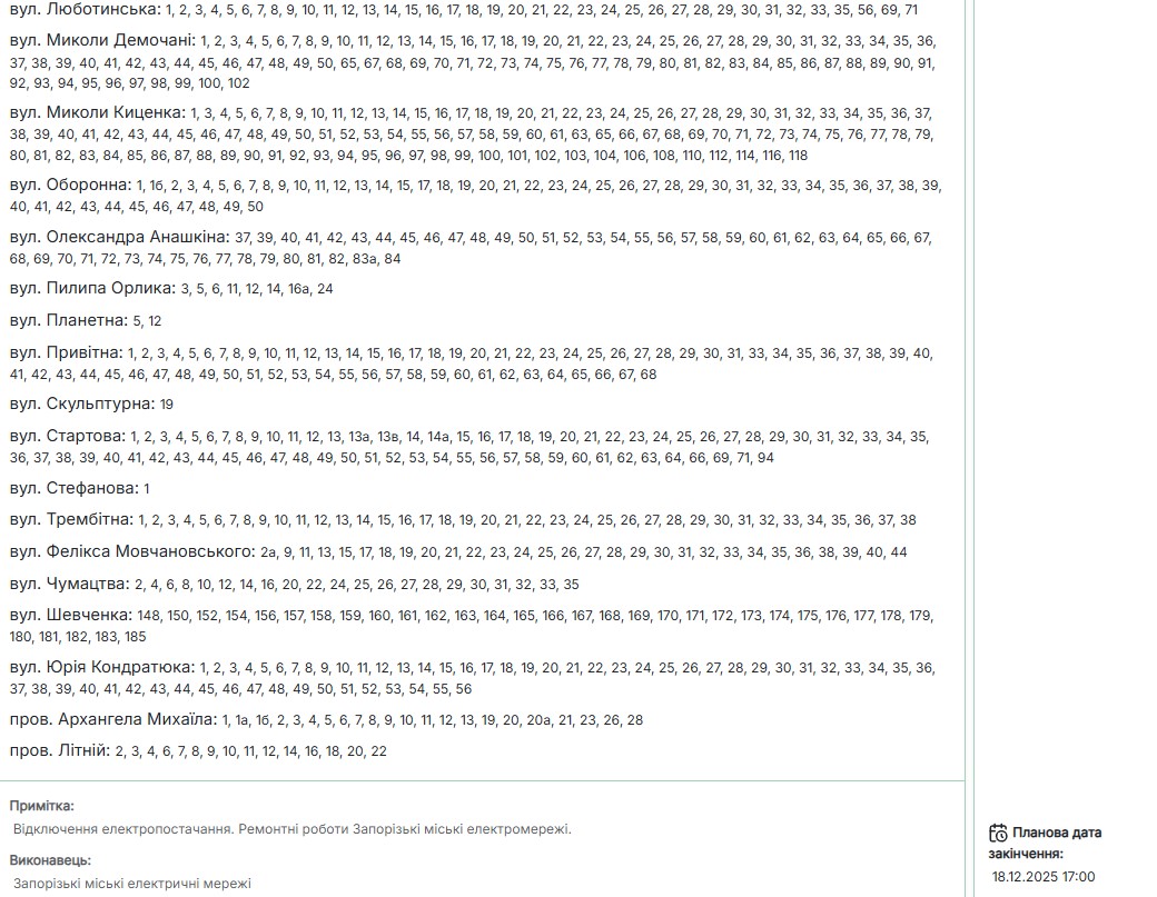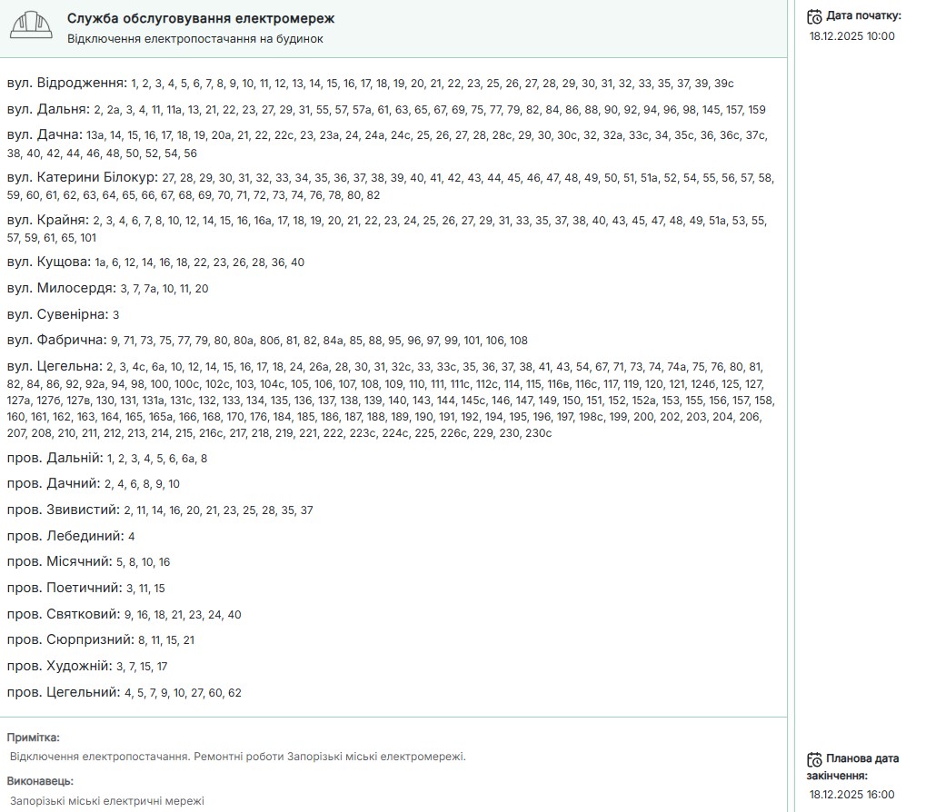 У четвер, 18 грудня, у різних районах Запоріжжя через ремонтні роботи знеструмлять кілька сотень будинків. Про це повідомляє "Справжнє" з посиланням на міський контакт-центр "15-80".