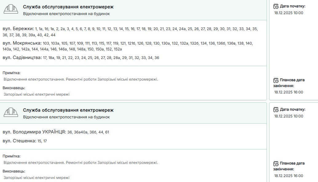 Із 10:00 до 16:00 через ремонтні роботи, які проводять Запорізькі міські електричні мережі, світла не буде за адресами: